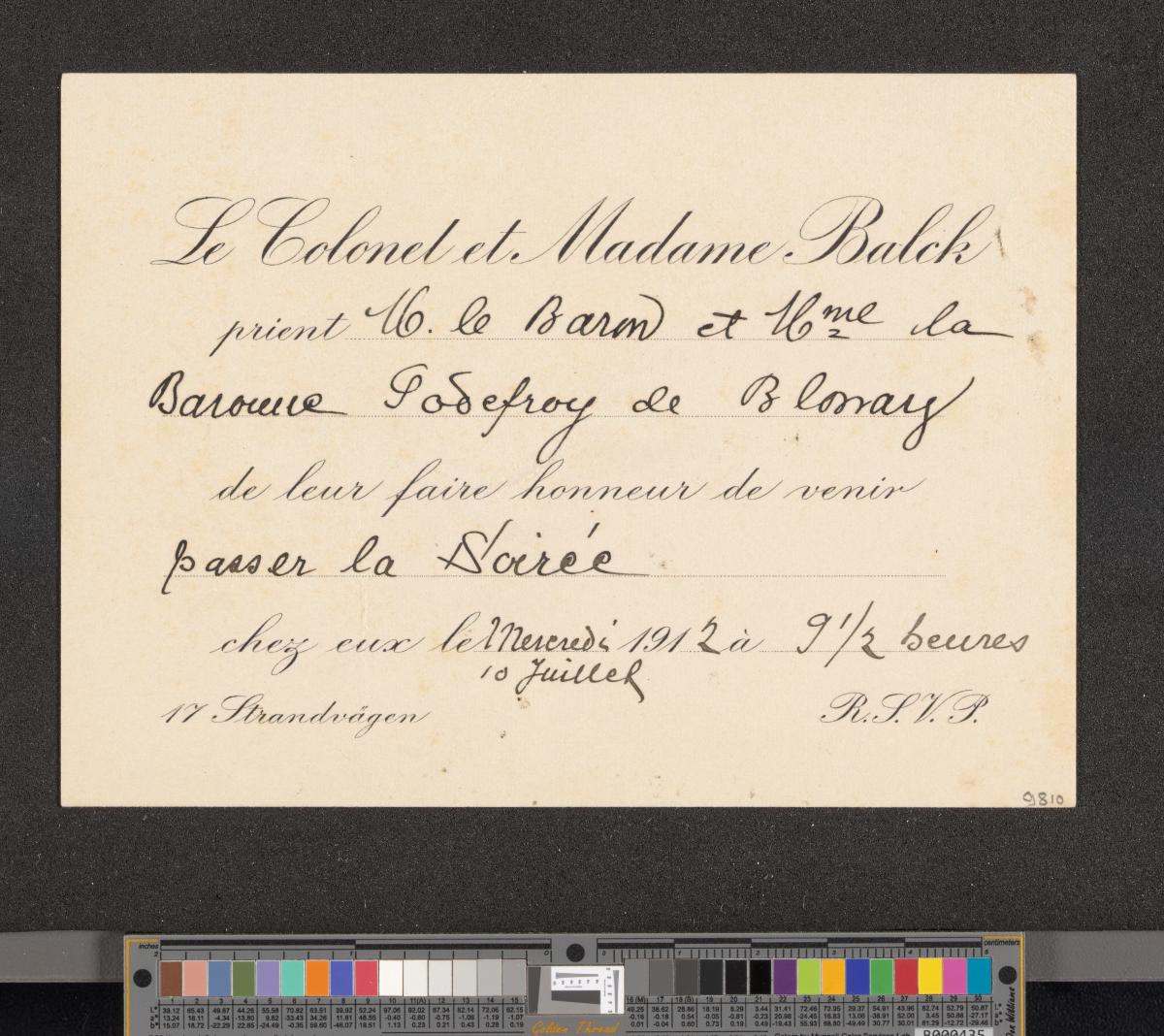 Stockholm 1912, invitation card to the evening July 10th from the Colonel and Mrs. Balck to the Baron and Baroness Madam Godefroy de Blonay.