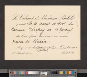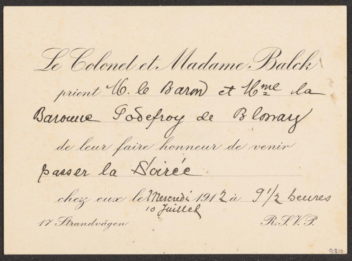 Invitation card with text: "Le Colonel et Madame Balck / prient M. le Baron et Mme la / Baronne Godefroy de Blonay / de leur faire honneur de venir / passer la soirée / chez eux le mercredi 10 Juillet 1912 à 91/2 heures.".