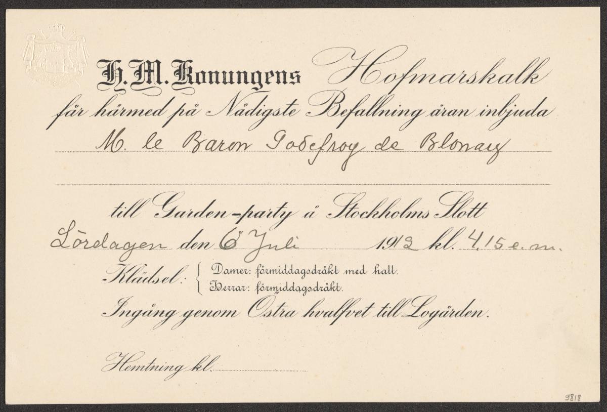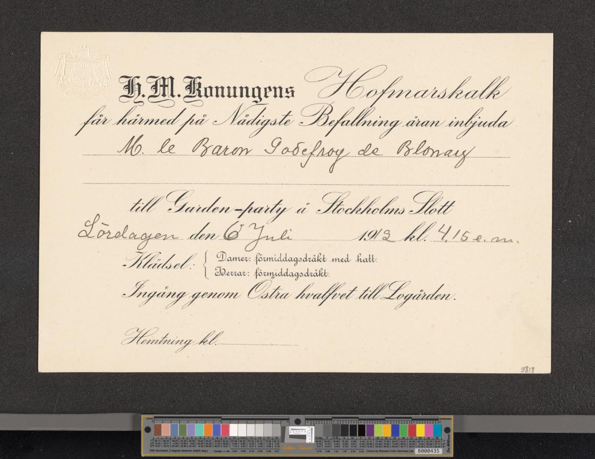 Invitation card with embossed arms of the Kingdom of Sweden. Text: "H.M. Konungens Hofmarskalk / fär härmed pä Nadigste Befallning äran inbjuda / M. le Baron Godefroy de Blonay / till Garden-party ä Stockholms Slott / Lördagen den 6 Juli 1912 kl. 4.15 e.m.".