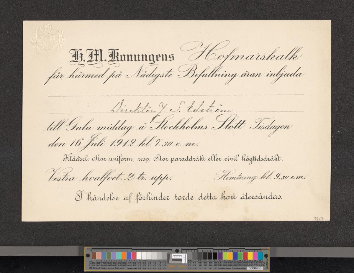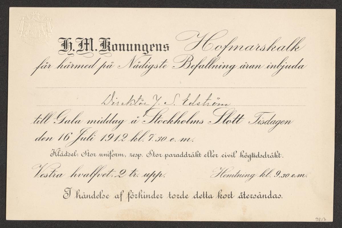 Invitation card with embossed arms of the Kingdom of Sweden. Text: "H.M. Konungens Hofmarskalk / fär härmed pä Nadigste Befallning äran inbjuda / Direktör J. S. Edström / till Gala midday ä Stockholms Slott Tisdagen / den 16 Juli 1912 kl. 7.30 e.m. / Klädseb Stor uniform, resp. Stor paraddräkt aller civil högtidsdräkt.".