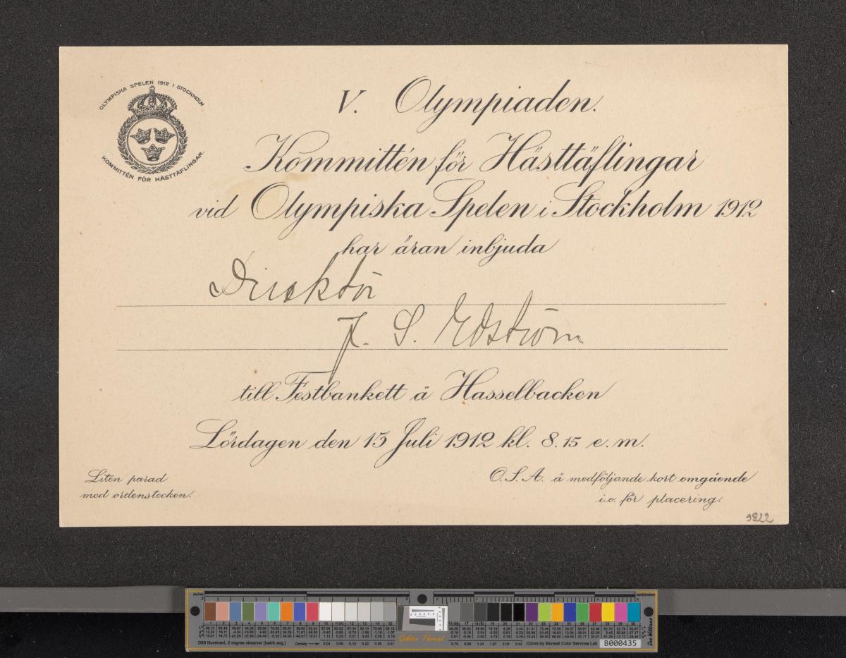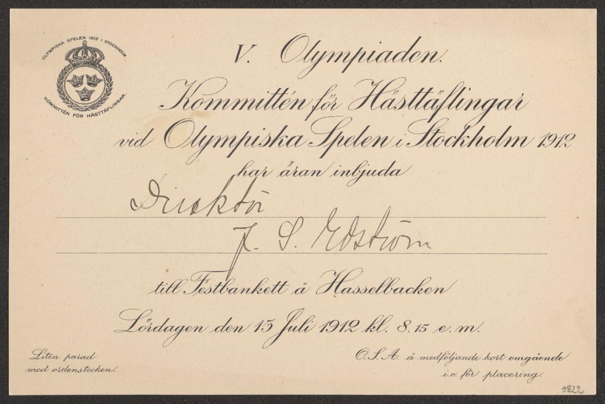 Rectangular card with the Lesser arms of the Kingdom of Sweden. Text: "V. Olympiaden. / Kommittén för Hästtäflingar / vid Olympiska Spelen i Stockholm 1912 / har äran inbjuda / Direktör / J.S. Edström / till Festbankett ä Hasselbacken / Lördagen den 15 Juli 1912 kl. 8.15 e.m.".