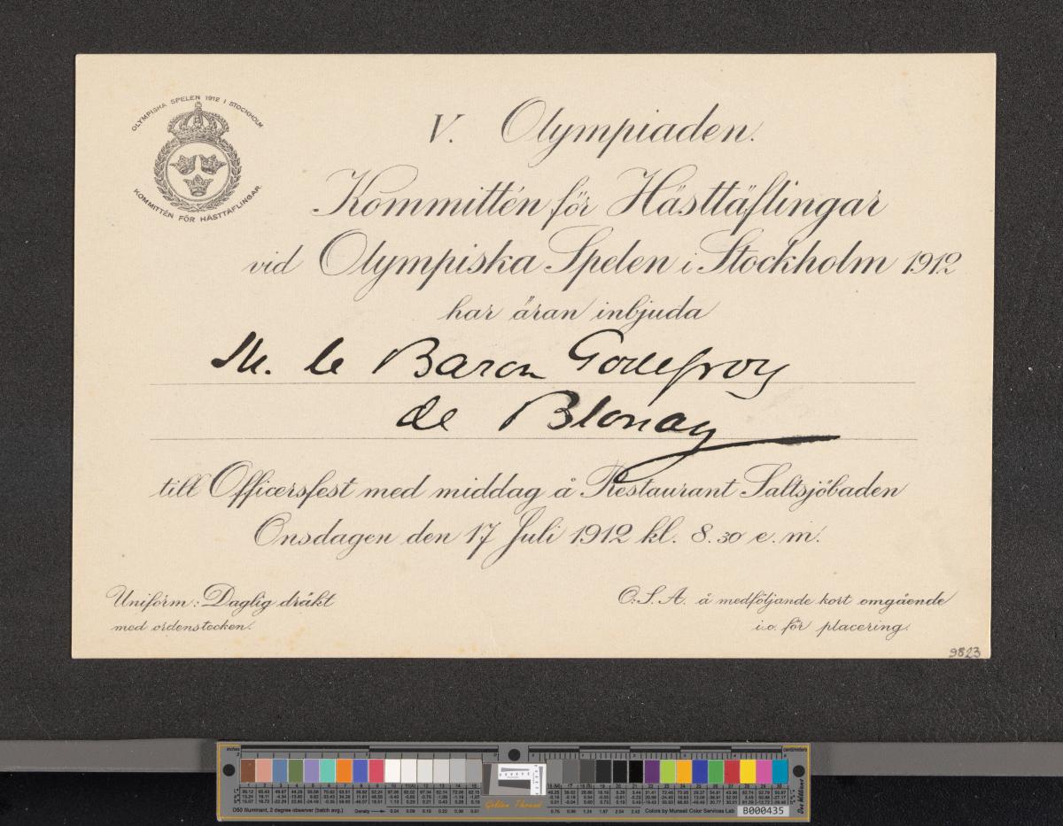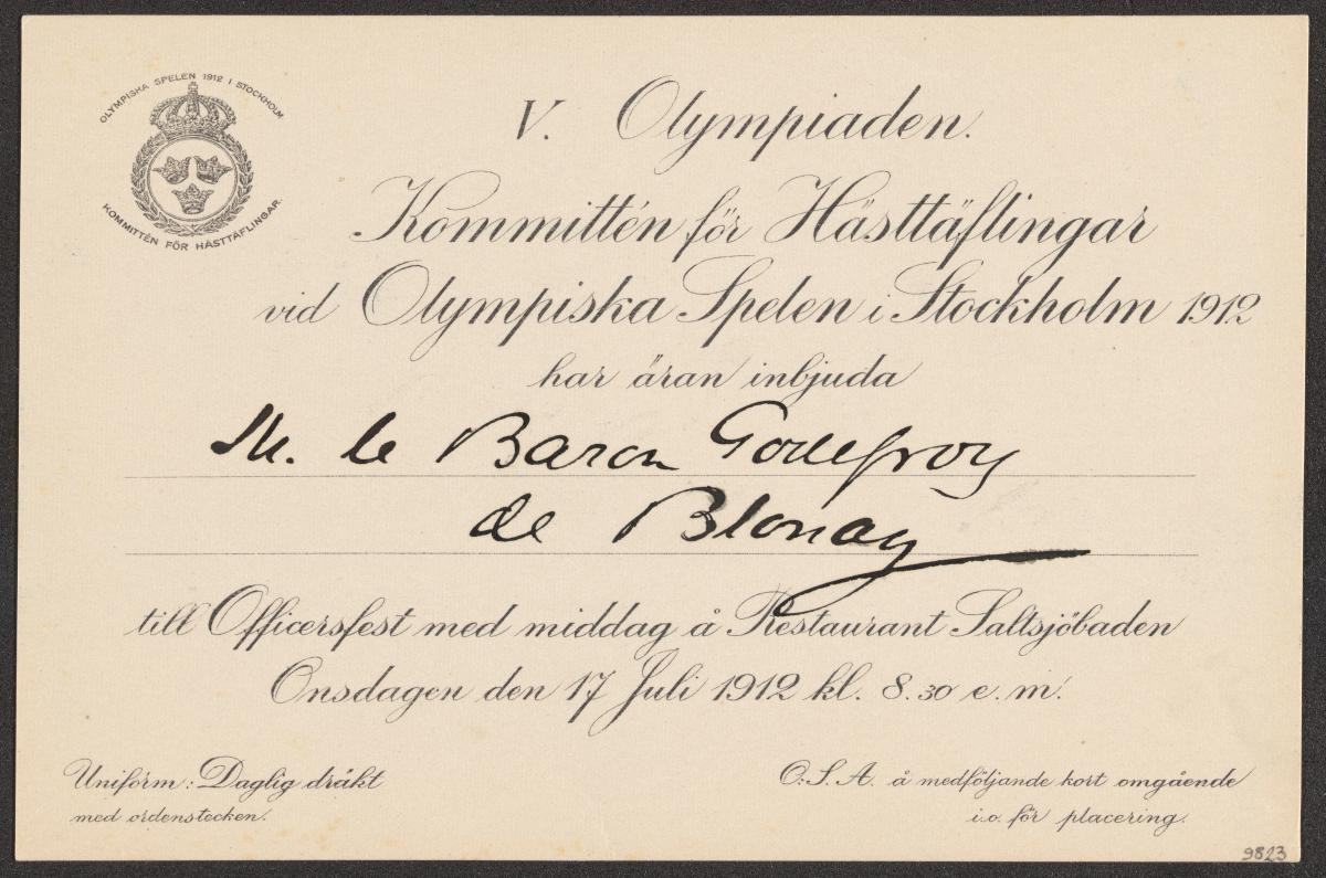 Rectangular card with the Lesser arms of the Kingdom of Sweden. Text: "V. Olympiaden. / Kommittén för Hästtäflingar / vid Olympiska Spelen i Stockholm 1912 / har äran inbjuda / M. le Baron Godefroy / de Blonay / till Officersfest med middag a Restaurant Saltsjöbaden / Onsdagen den 17 Juli 1912 kl. 8.30 e.m.".