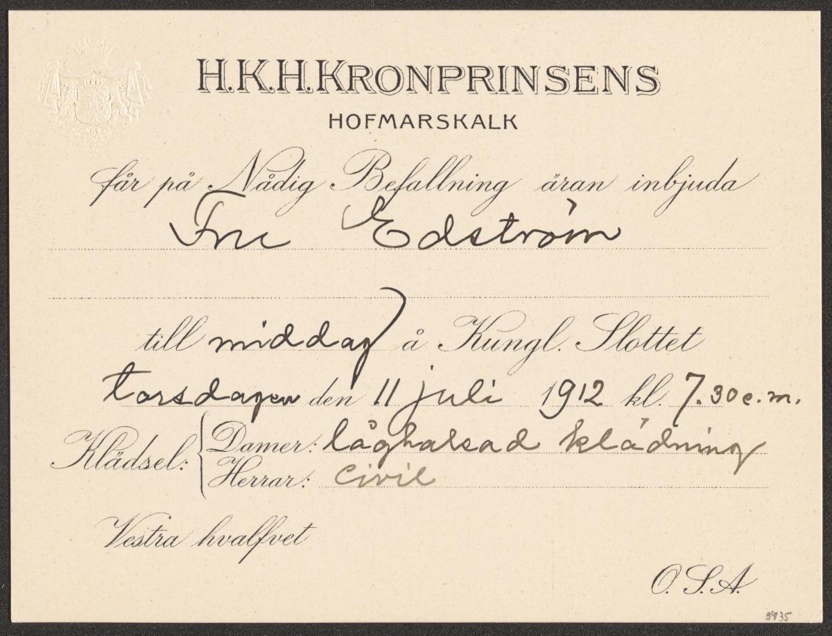 Invitation card embossed with the arms of the kingdom of Sweden. Text: "H.K.H.KRONPRINSENS / HOFMARSKALK / fär pa Nadig Befallning äran inbjuda / Fru Edström / till middag a Kungl. Slottet / tarsdajew den 11 juli 1912 kl. 7.30 e.m.".
