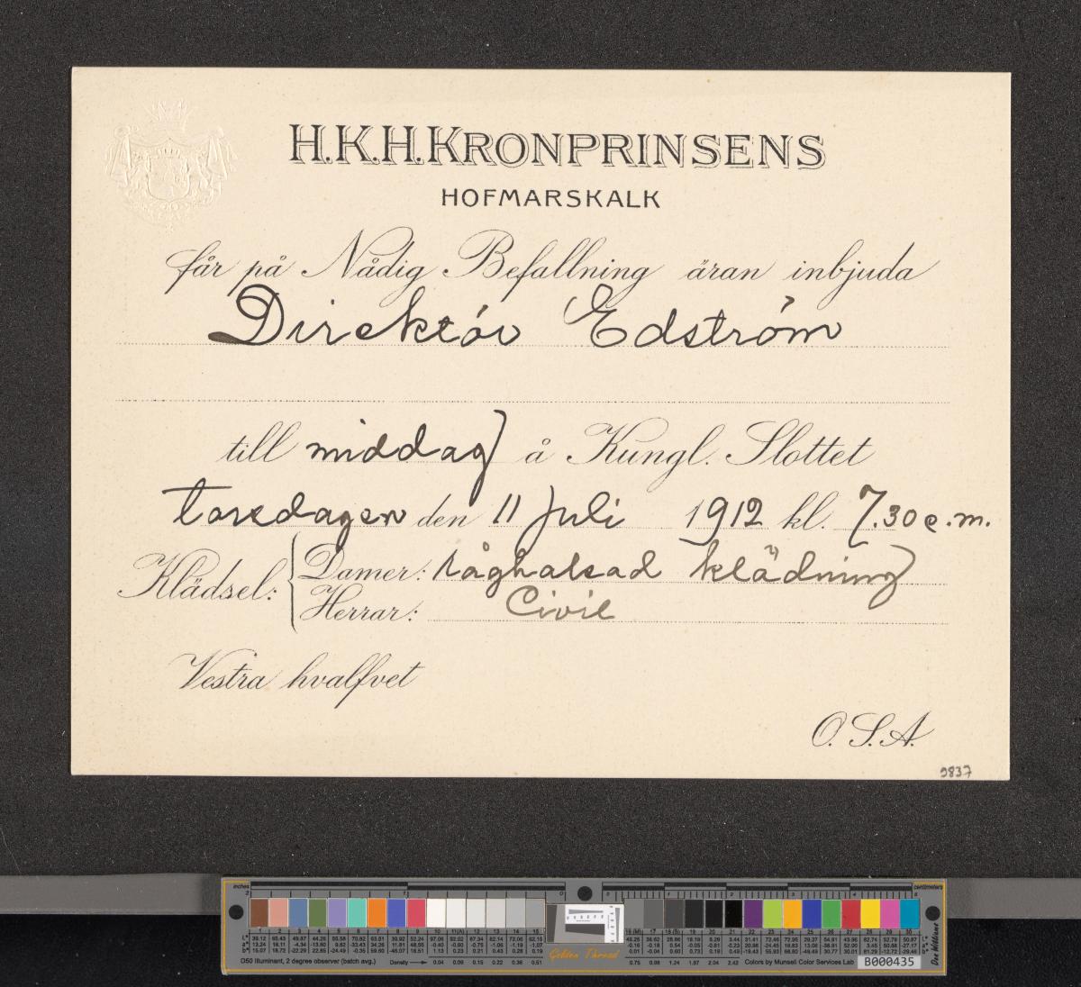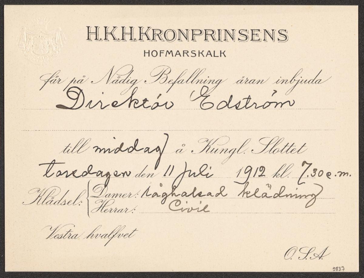 Invitation card embossed with the arms of the kingdom of Sweden. Text: "H.K.H.KRONPRINSENS / HOFMARSKALK / fär pa Nadig Befallning äran inbjuda / Direktör Edström / till middag a Kungl. Slottet / taredagen den 11 juli 1912 kl. 7.30 e.m.".
