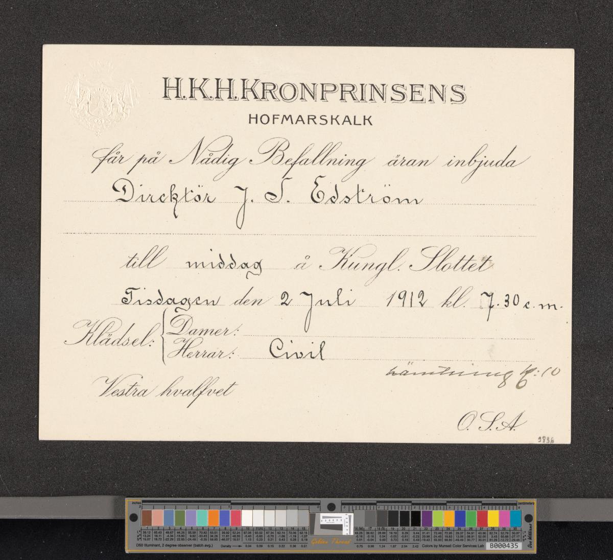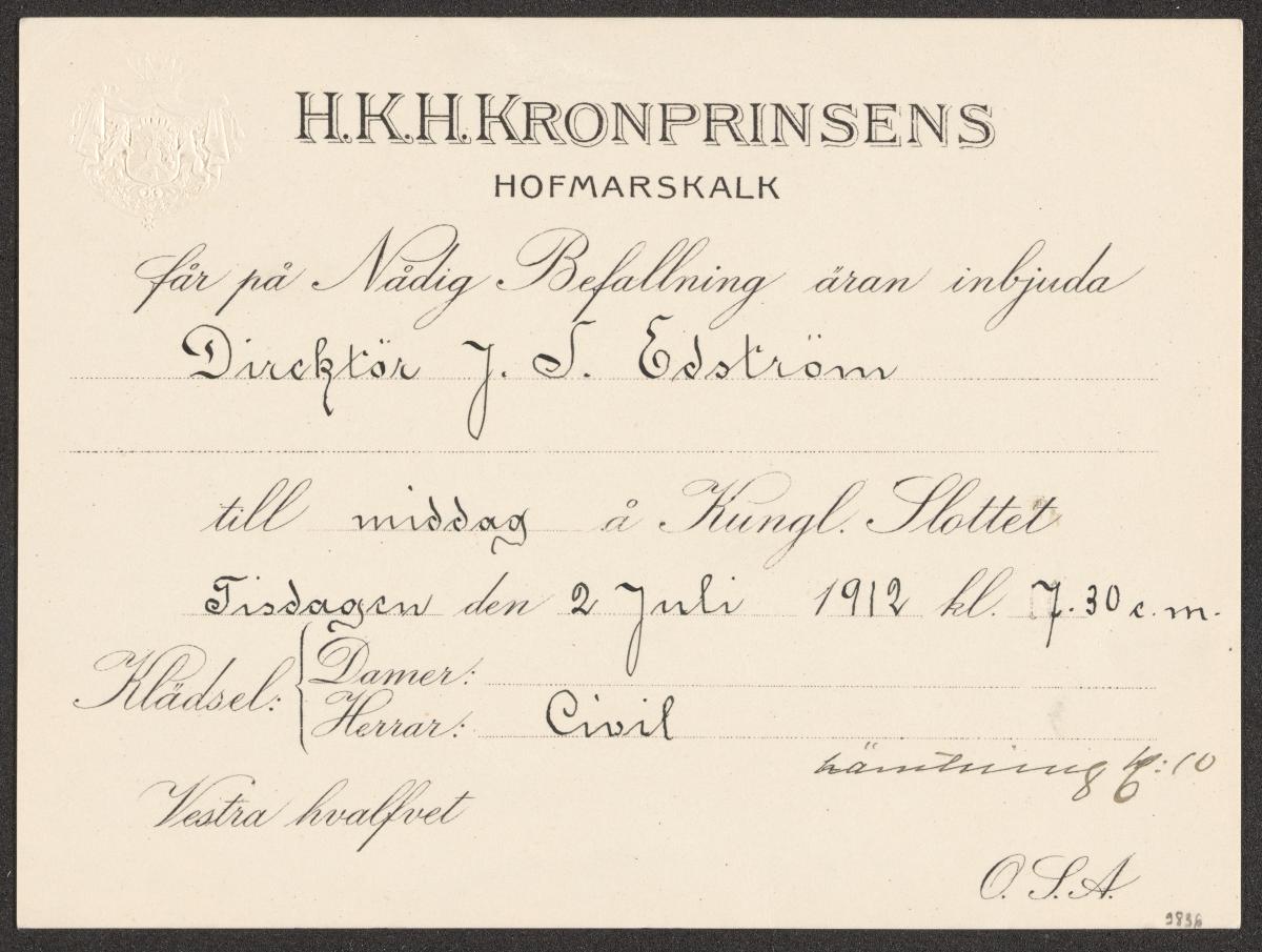 Invitation card embossed with the arms of the kingdom of Sweden. Text: "H.K.H.KRONPRINSENS / HOFMARSKALK / fär pa Nadig Befallning äran inbjuda / Direktör J. S. Edström / till middag a Kungl. Slottet / tisdagen den 2 juli 1912 kl. 7.30 e.m.".