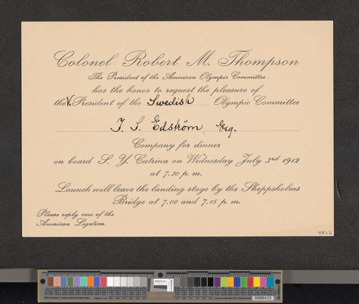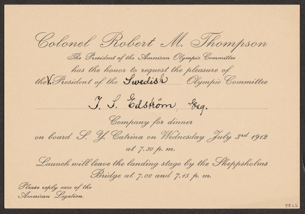 Invitation card with the text: "Colonel Robert M. Thompson / The President of the American Olympic Committee / has the honor to request the pleasure of / the V. President of the Swedish Olympic Committee / J. S. Edström, Esq. / Company for dinner / on board S. Y. Catrina on Wednesday July 3rd 1912 / at 7.30 p.m. / Launch will leave the landing stage by the Sheppsholms / Bridge at 7.00 and 7.15 p.m.".