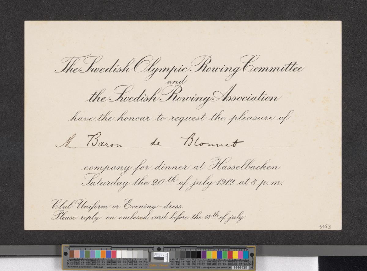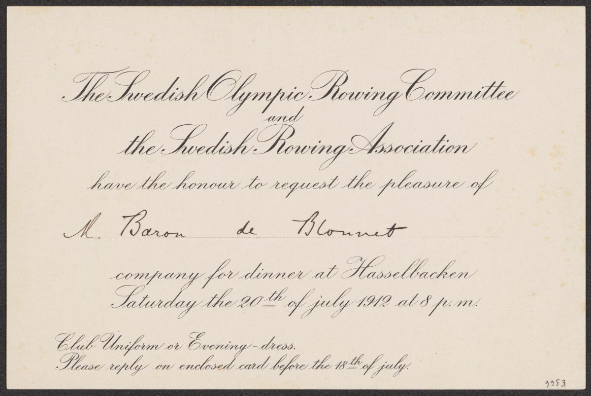 Rectangular invitation card, text: "The Swedish Olympic Rowing Committee / and / the Swedish Rowing Association / have the honour to request the pleasure of / M. Baron de Blonnet / company for dinner at Hasselbacken / Saturday the 20th of july 1912 at 8 p.m.".