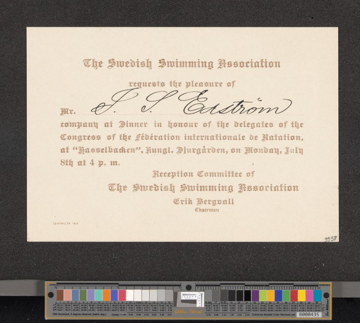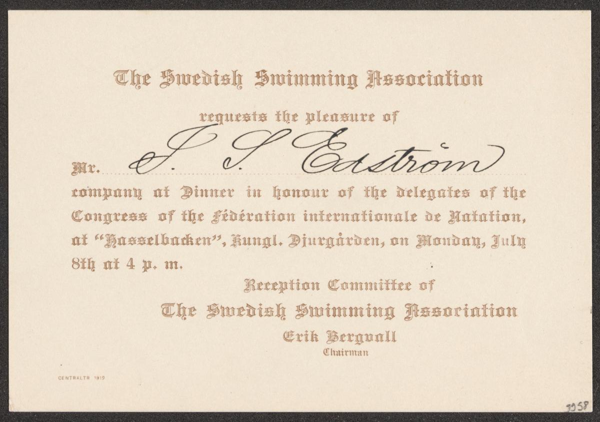 Rectangular invitation card, text: "The Swedish Swimming Association / requests the pleasure of / Mr. J. S. Edström / company at Dinner in honour of the delegates of the / Congress of the Fédération Internationale de Natation, / at -Hasselbacken-, Kungl. Djurgarden, onMonday, July / 8th at 4 p. m.".