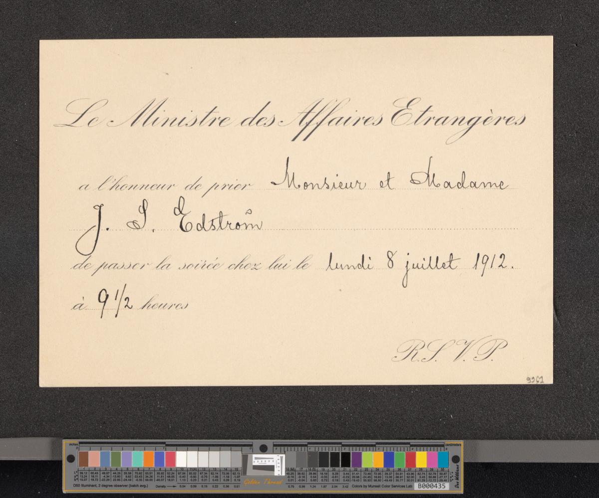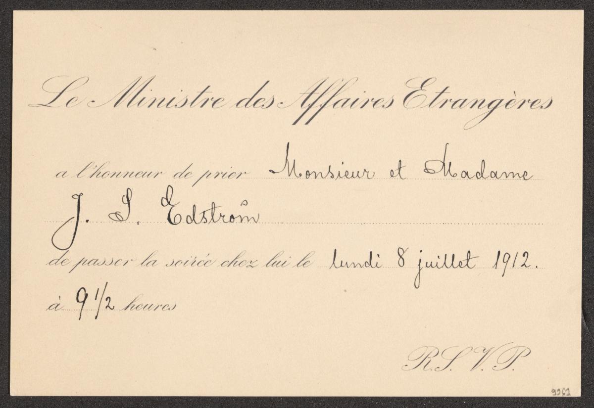 Rectangular card with the text: "Le Ministère des Affaires Etrangères / a l'honneur de prier Monsieur et Madame / J. S. Edström / de passer la soirée chez lui le lundi 8 juillet 1912. / à 9 1/2 heures".