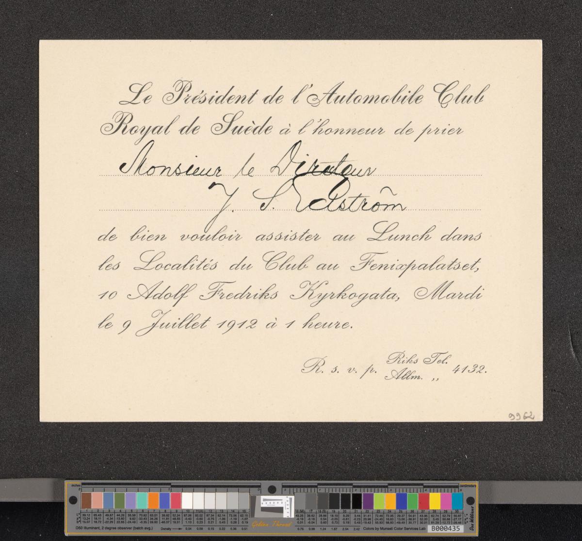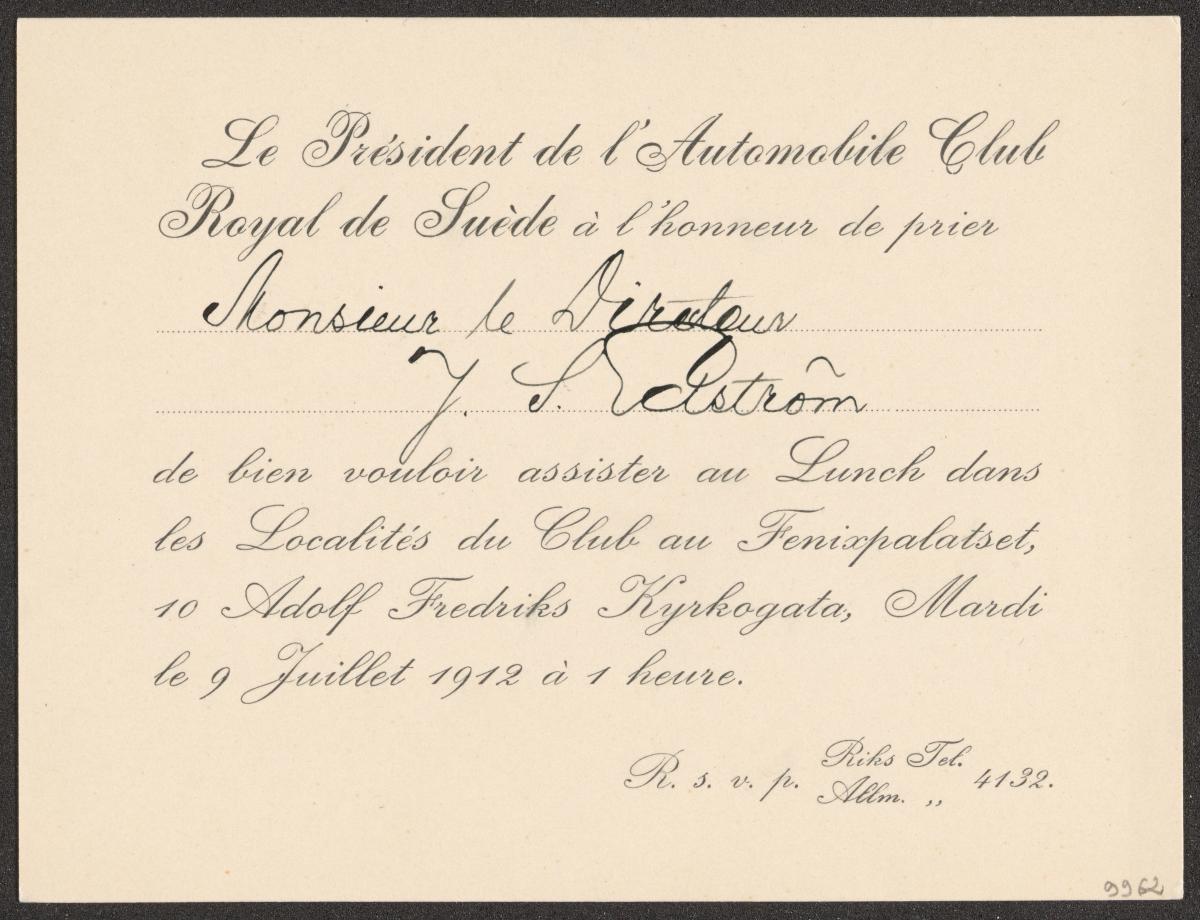Invitation card, text: "Le Président de l'Automobile Club / Royal de Suède à [sic!] l'honneur de prier / Monsieur le Directeur / J. S. Edström / de bien vouloir assister au Lunch dans / les Localités du Club au Fenixpalatset, / 10 Adolf Fredriks Kyrkogata, Mardi / le 9 Juillet 1912 à 1 heure.".
