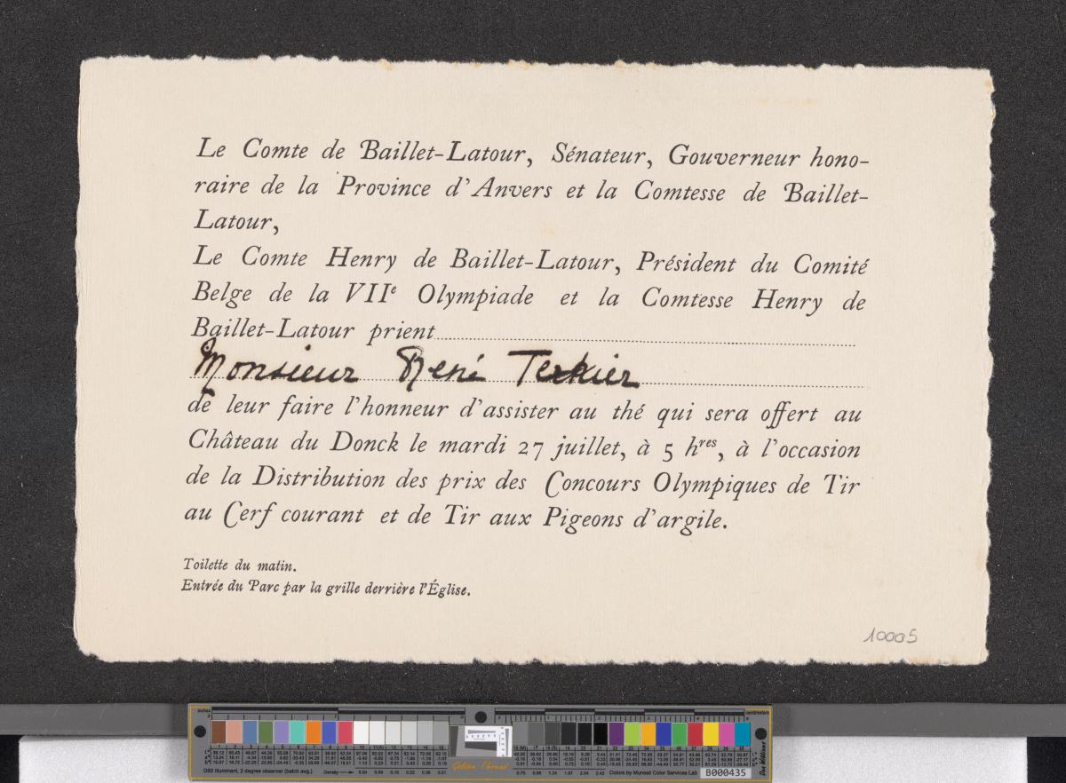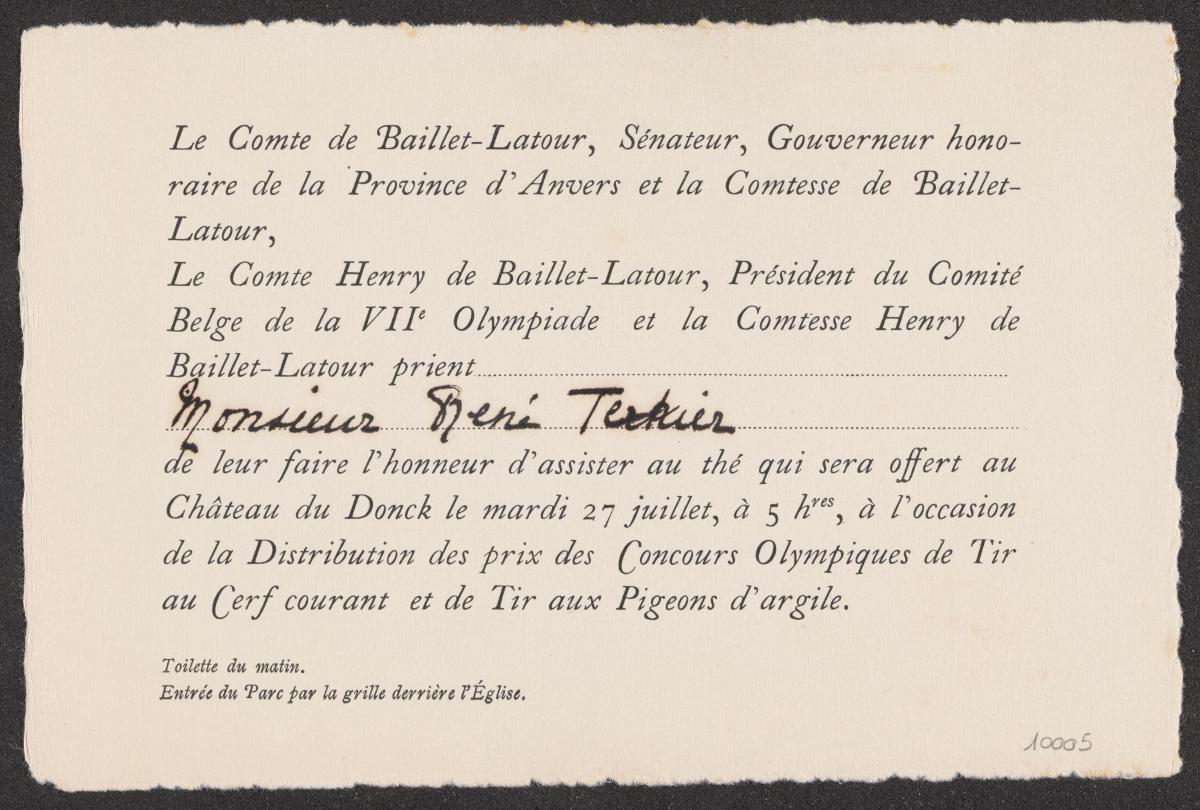 Antwerp 1920, invitation to tea July 27th by the count and countess Henry de Baillet-Latour to René Terkier.
