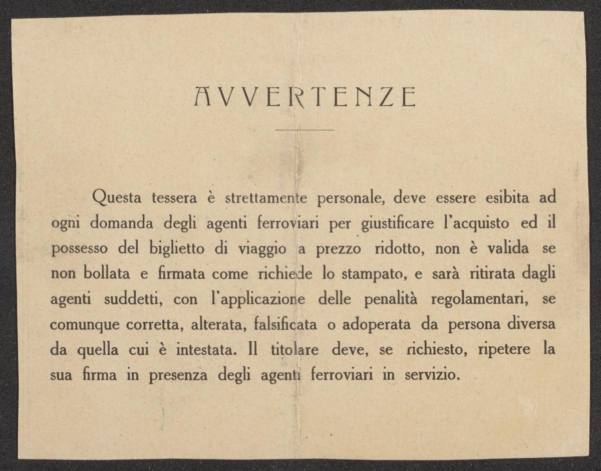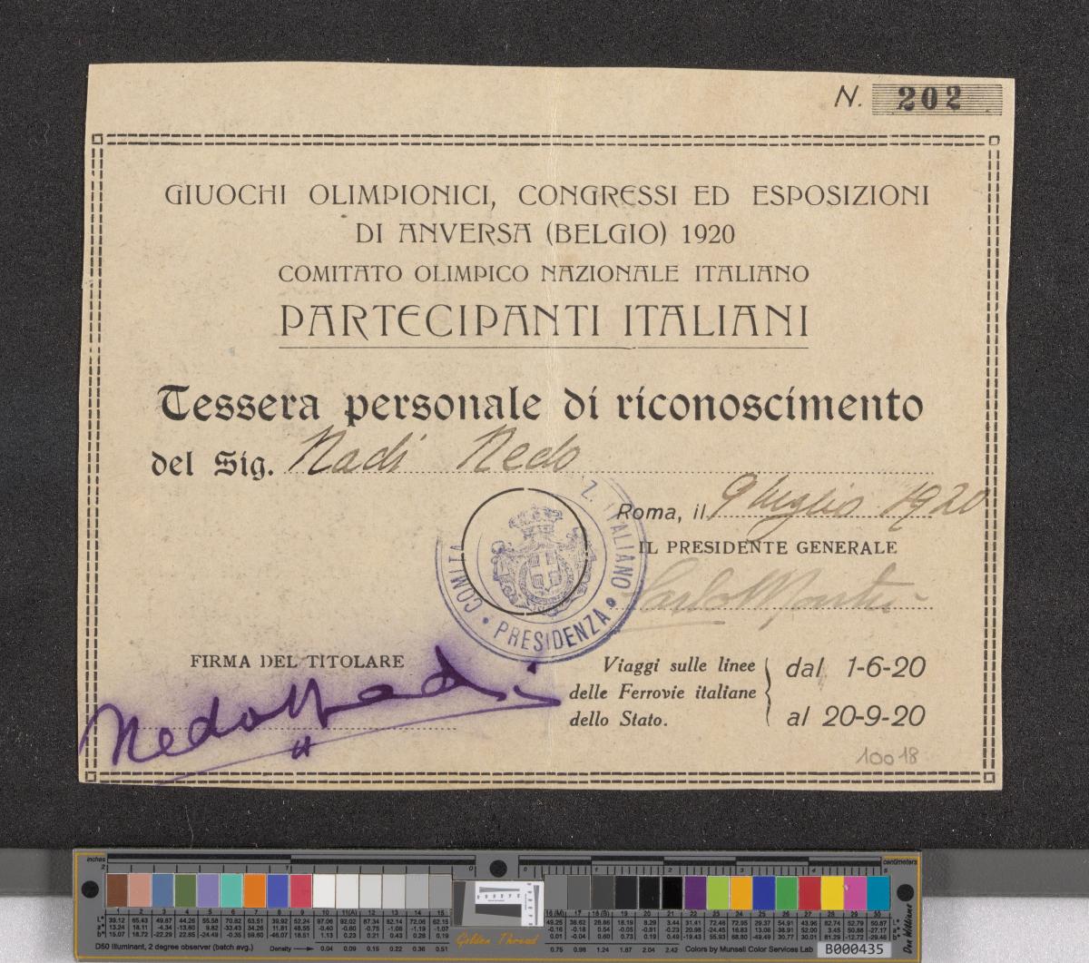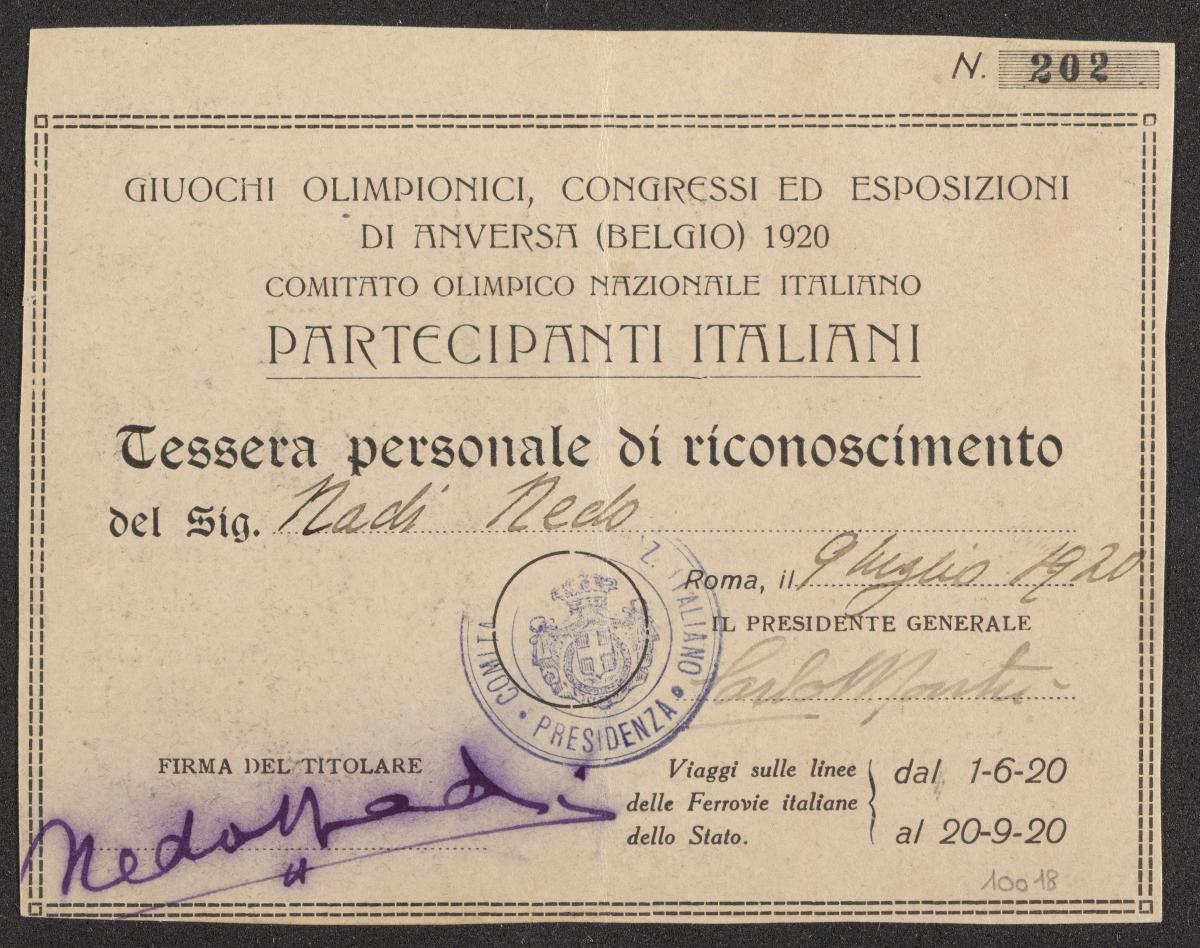Antwerp 1920, travel card issued to Nedo NADI (ITA) which enabled the Olympic athletes to freely on Italian trains.