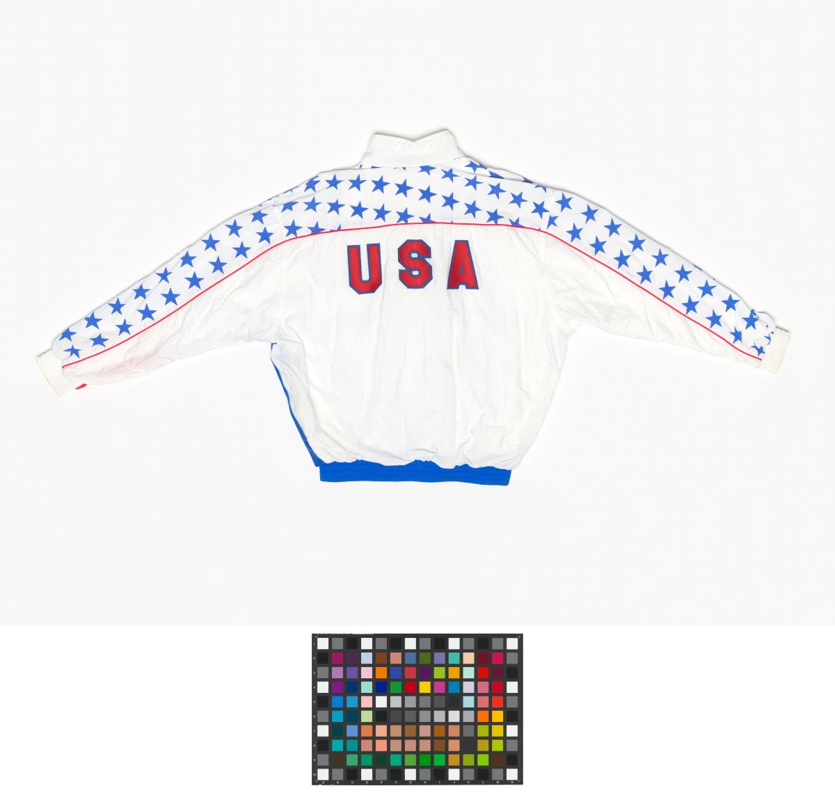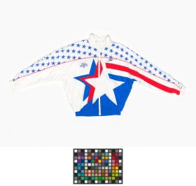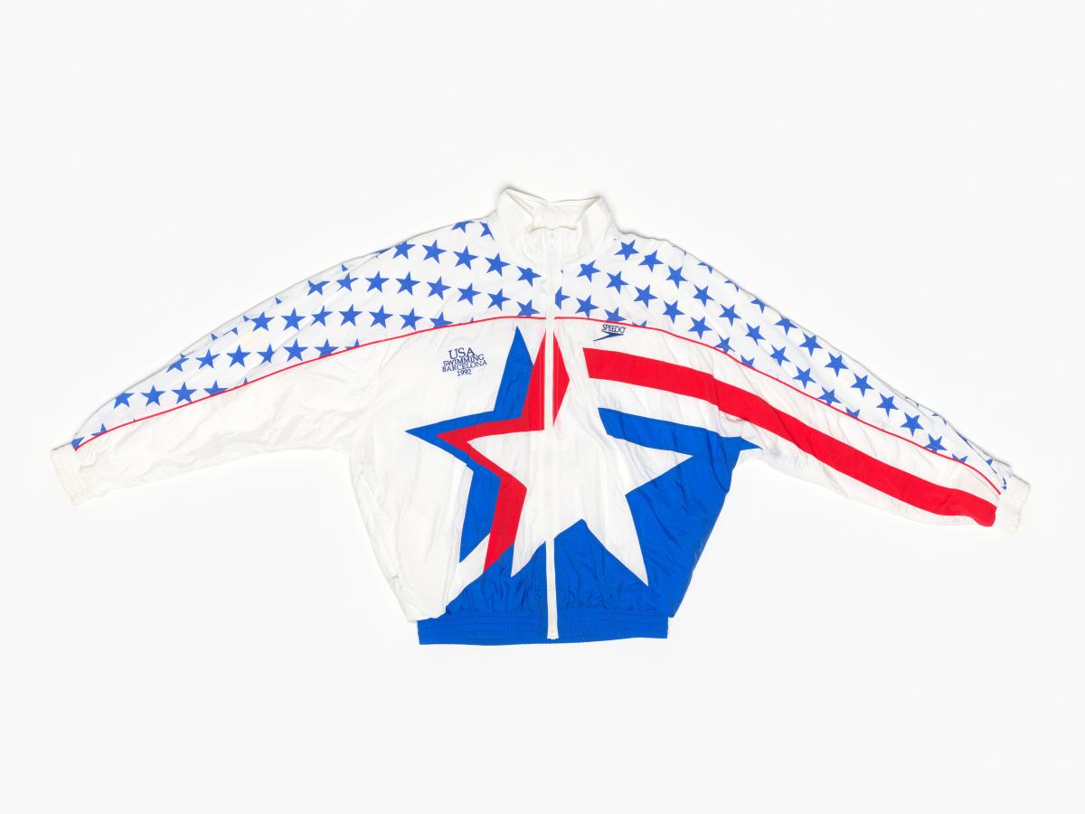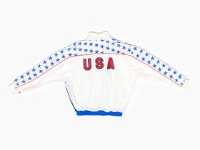 Tracksuit jacket of the US swimming team worn by Janet EVANS (USA), 800m freestyle Olympic champion and 400m freestyle silver medallist.