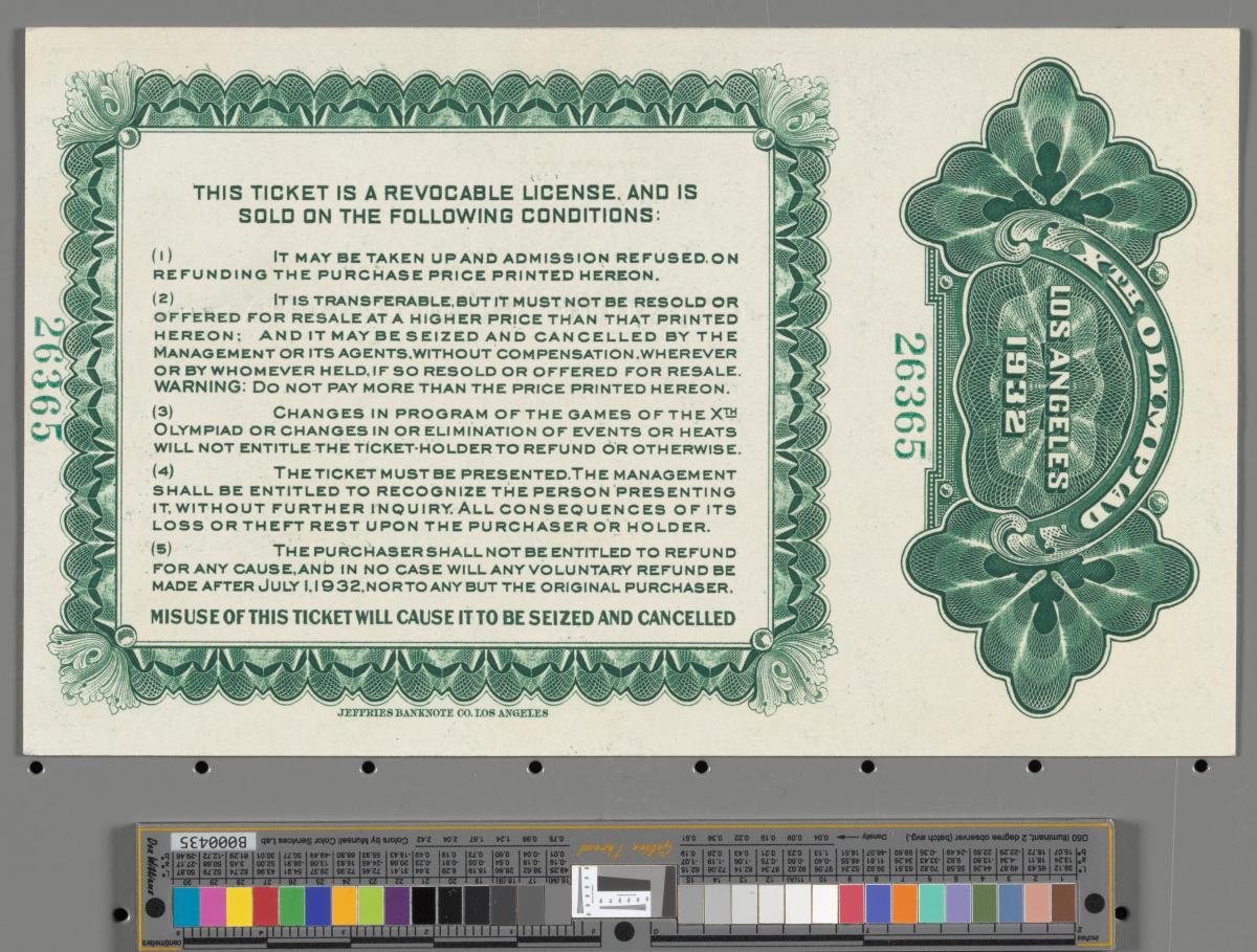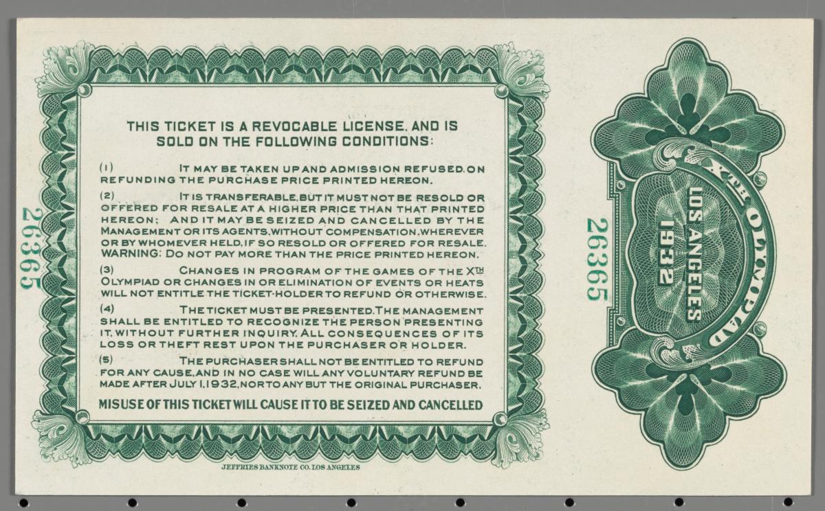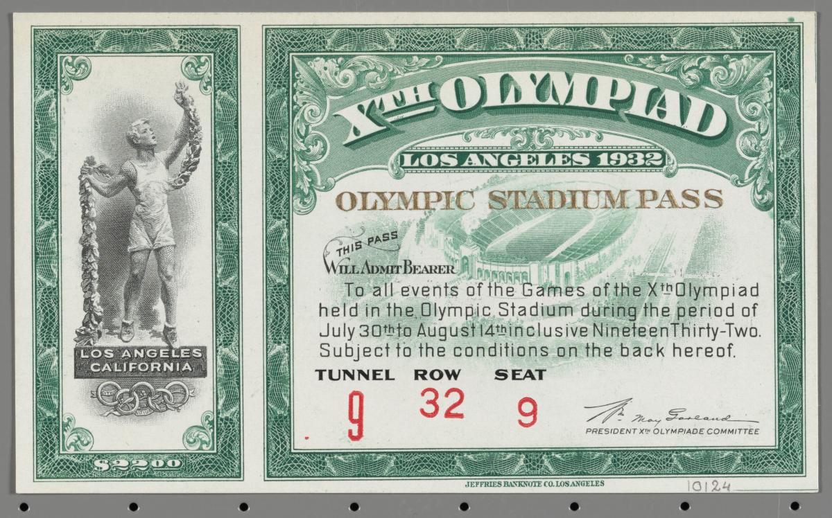 Los Angeles 1932, season ticket to the Olympic stadium from July 30th to August 14th.