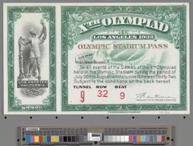 Pass with the drawing of the official poster on the left and those of the olympic stadium on the right as background. Text: "XTH OLYMPIAD / LOS ANGELES 1932 / OLYMPIC STADIUM PASS". Rules on the back.