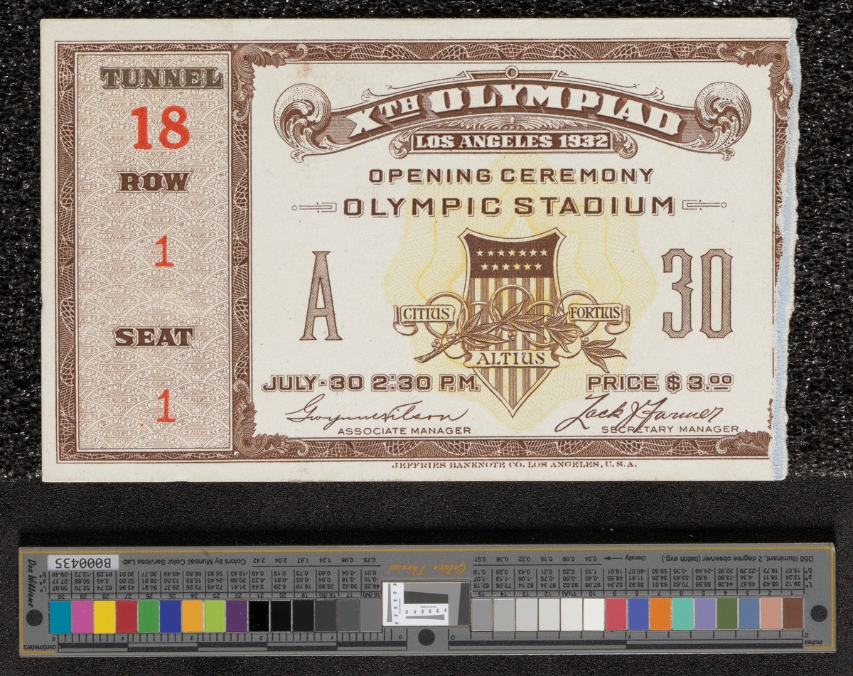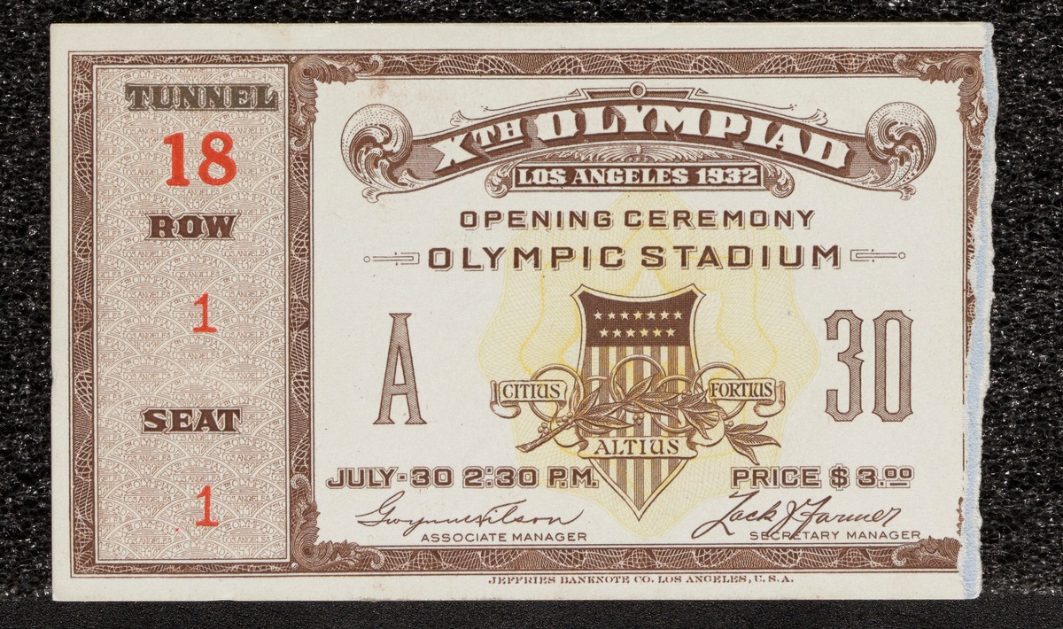 Los Angeles 1932, entrance ticket to the Olympic stadium for the opening ceremony on July 30th.