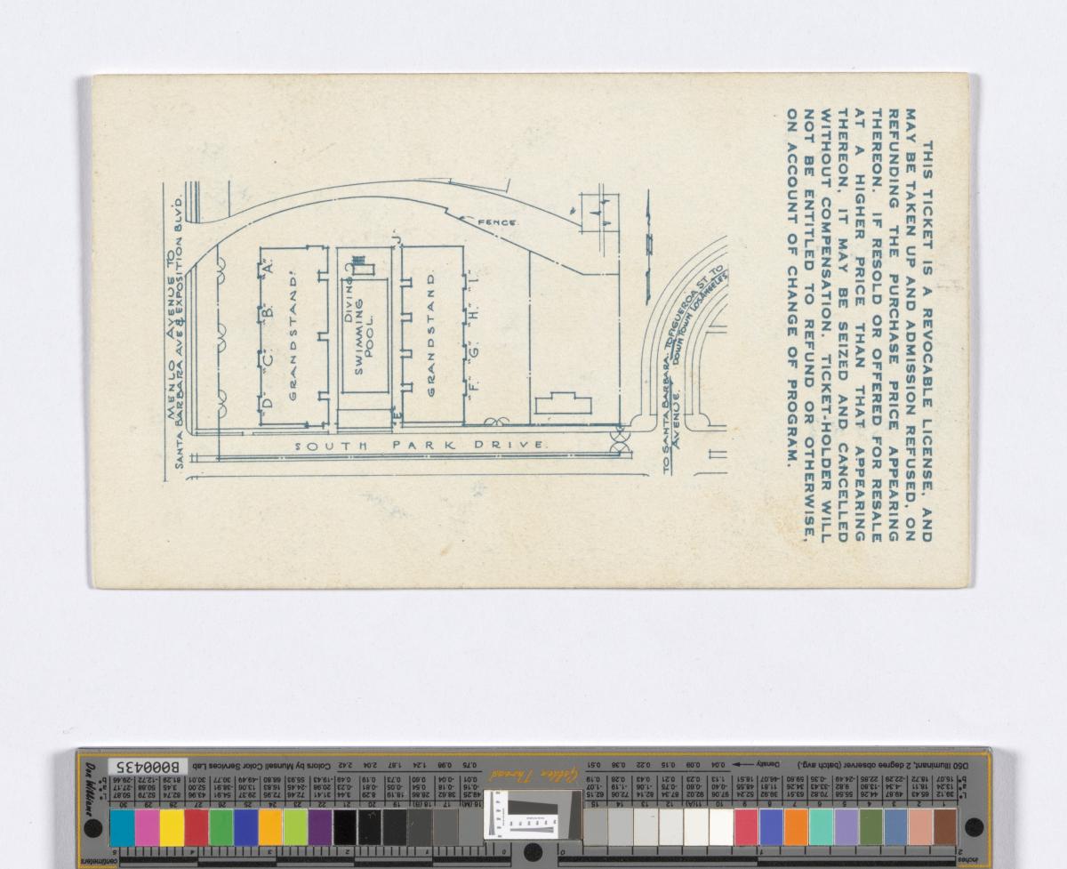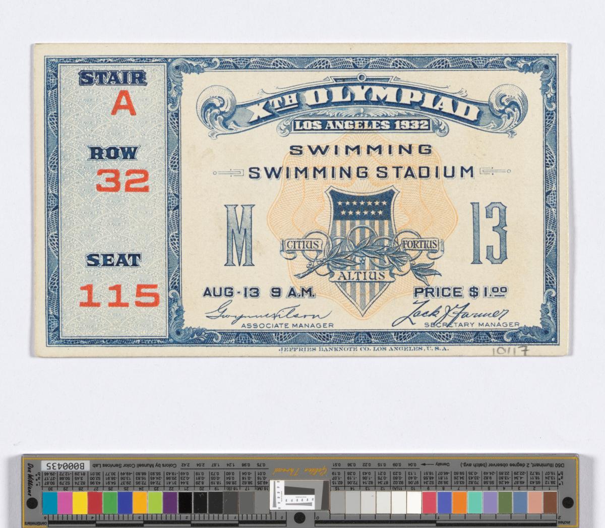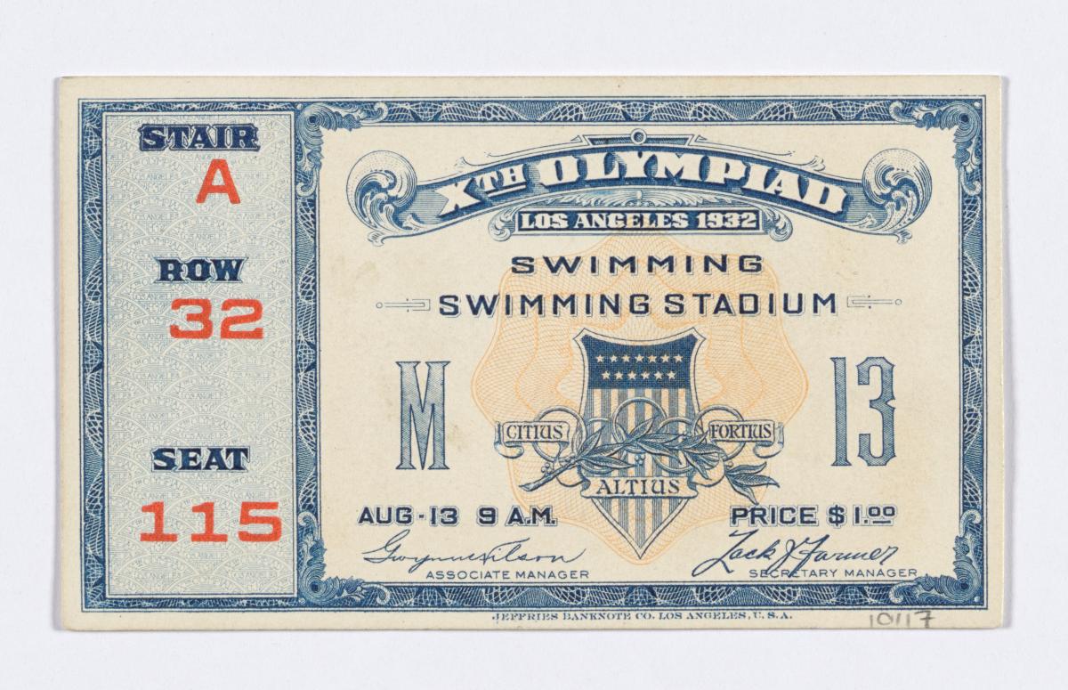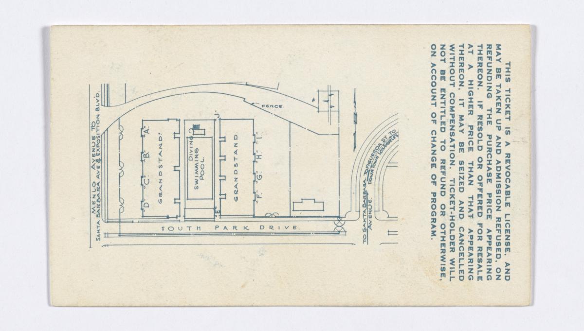 Entrance ticket with the Games' emblem and the plan of the swimming stadium on the back. Text: "Xth OLYMPIAD / LOS ANGELES 1932 / SWIMMING / SWIMMING STADIUM".
