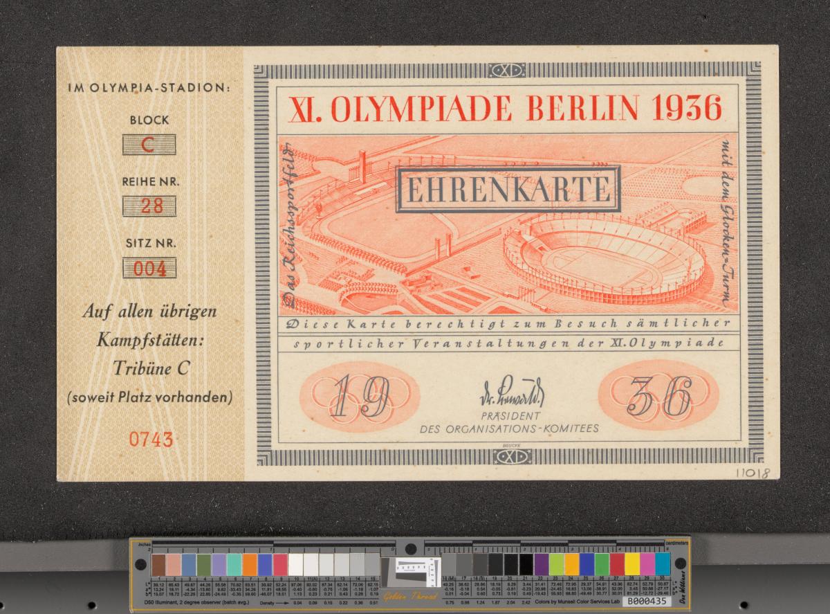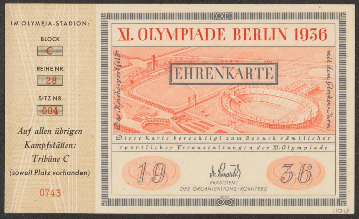 Ticket with the view of the Olympic Stadium and Reichssportfeld in the background. Text: "XI. OLYMPIADE BERLIN 1936 / EHRENKARTE / Das Reichssportfeld - mit dem Glocken-Turm / Diese Karte berechtigt zum Besuch sämlicher / sportlicher Veranstaltungender XI. Olympiade".