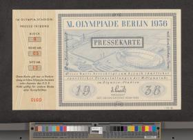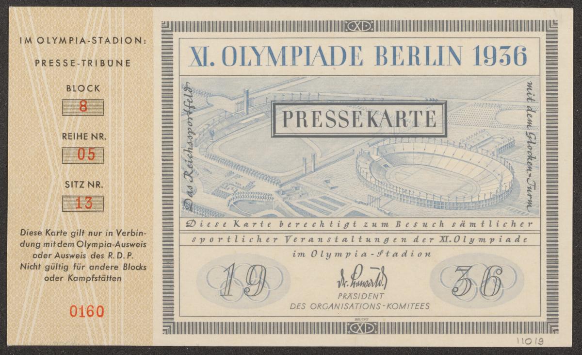 Ticket with the view of the Olympic Stadium and Reichssportfeld in the background. Text: "XI. OLYMPIADE BERLIN 1936 / PRESSEKARTE / Das Reichssportfeld - mit dem Glocken-Turm / Diese Karte berechtigt zum Besuch sämlicher / sportlicher Veranstaltungender XI. Olympiade".