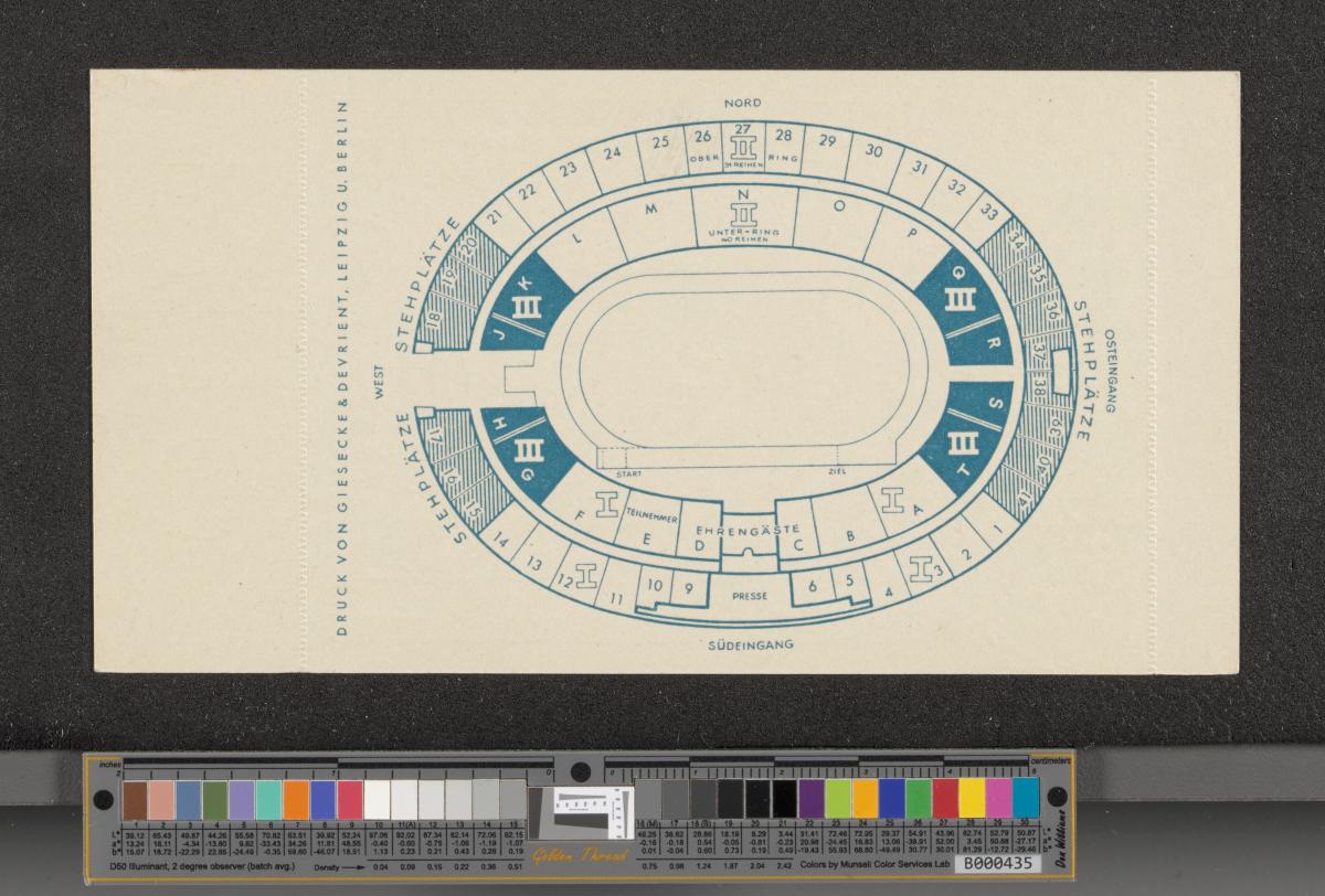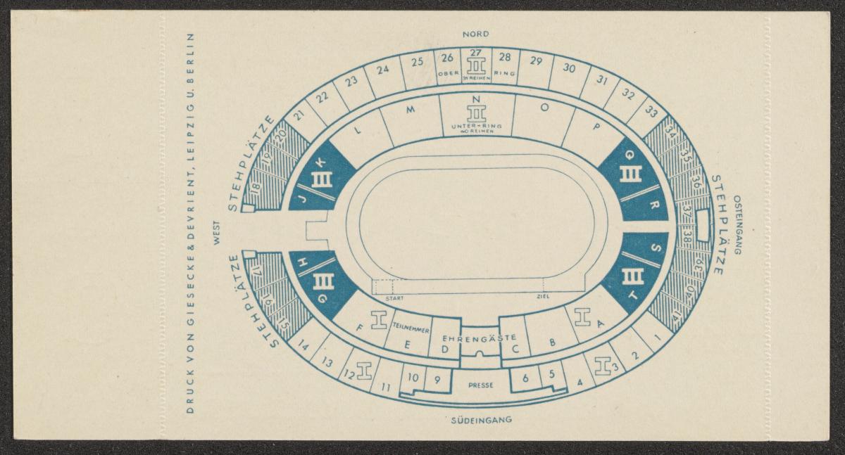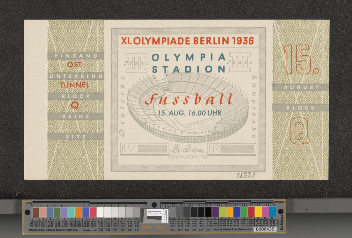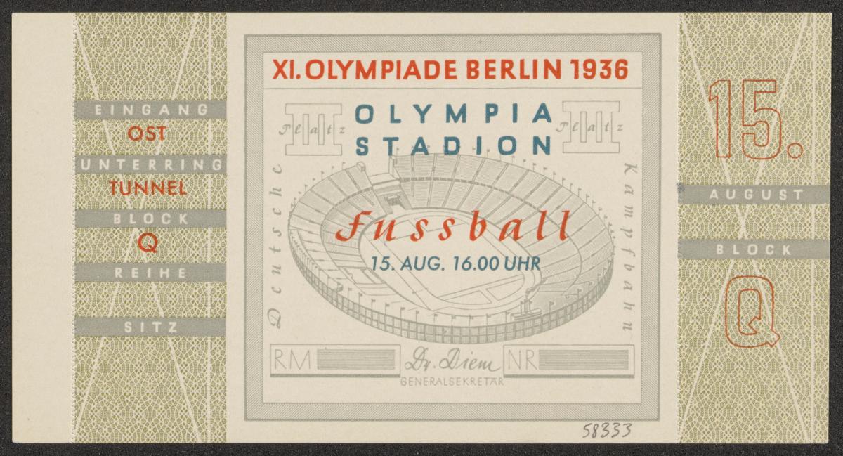Entrance ticket with the Olympic Stadium in the background, text: "XI. OLYMPIADE BERLIN 1936 / OLYMPIA / STADION / Fussbal. / 15. AUG. 16.00 UHR". Map of the stadium on the back. Coupon uncut.