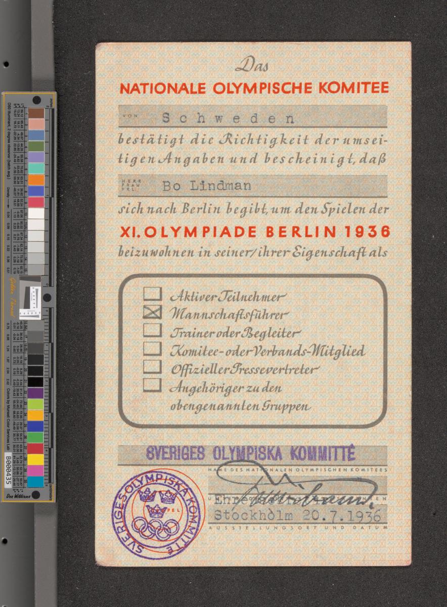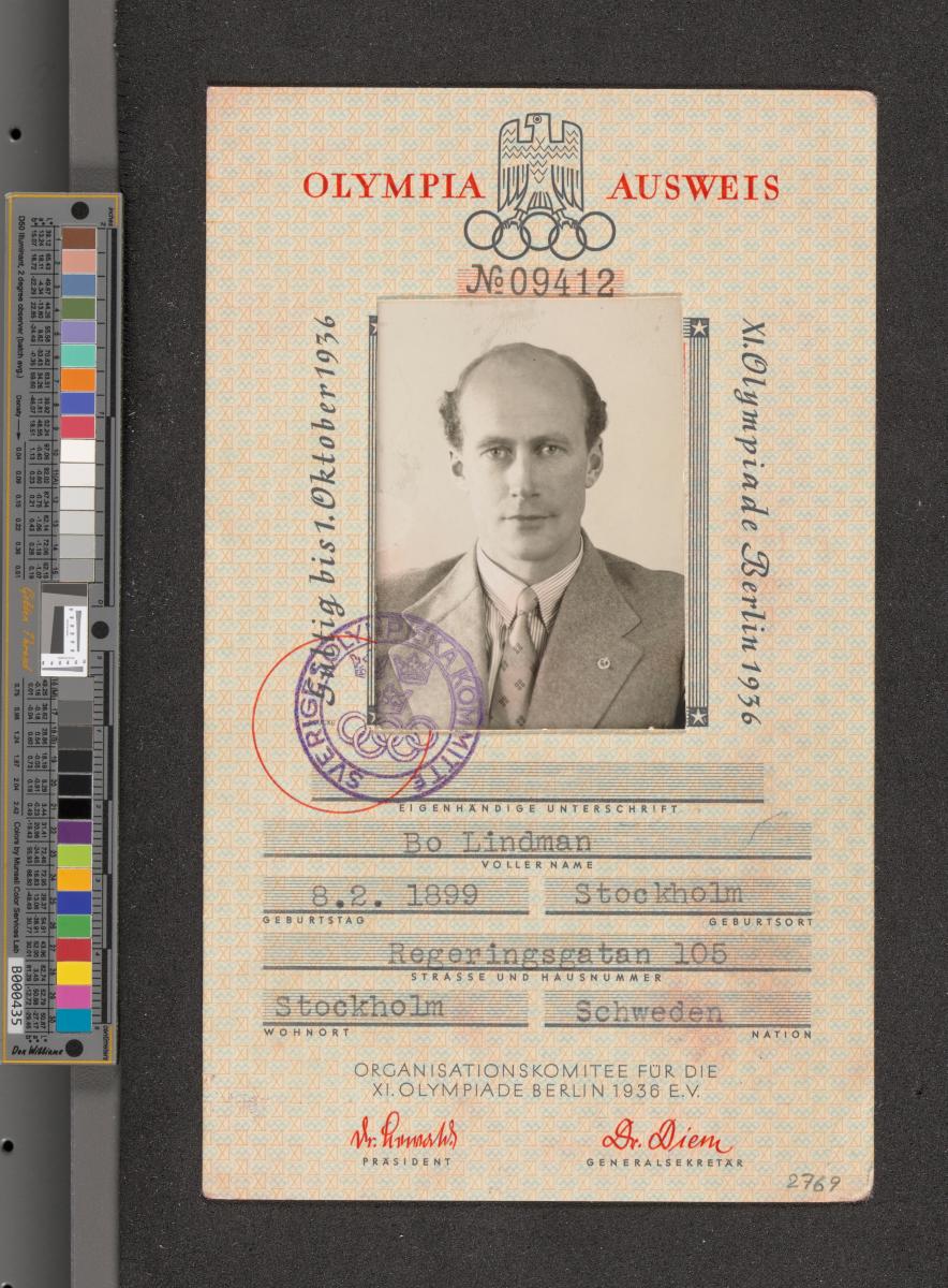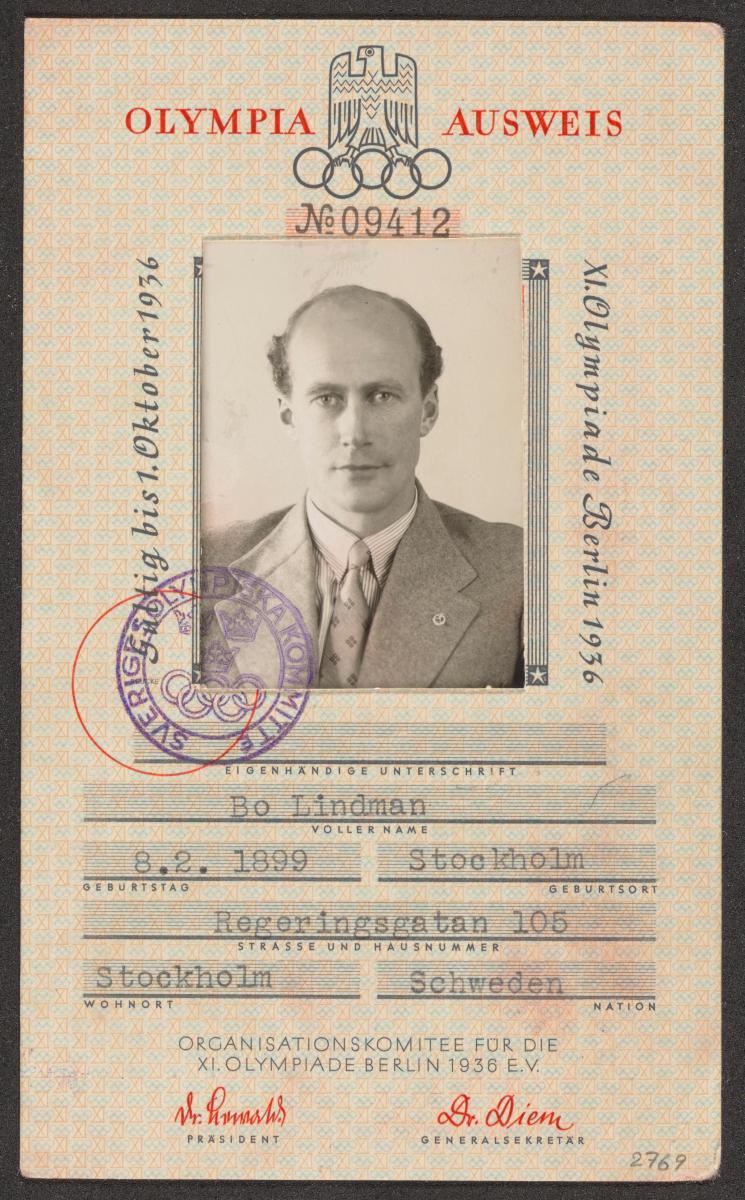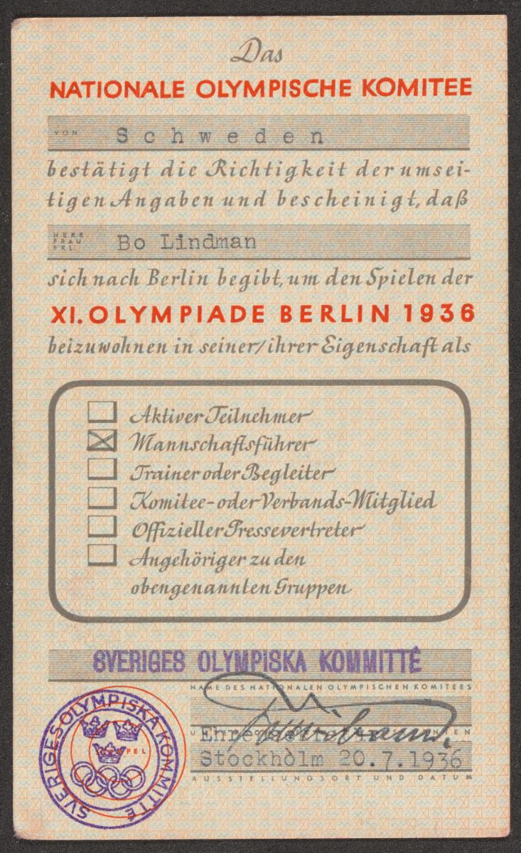 Berlin 1936, identity card of Bo LINDMAN (SWE), team captain.