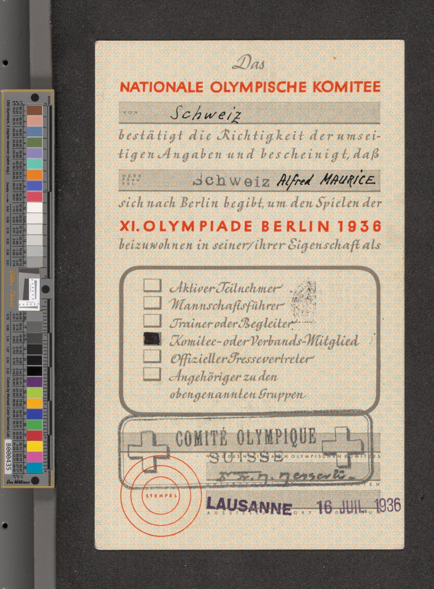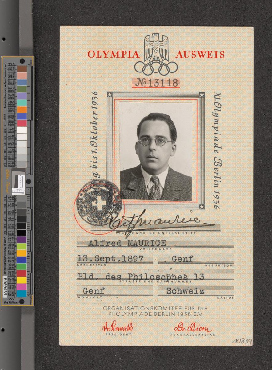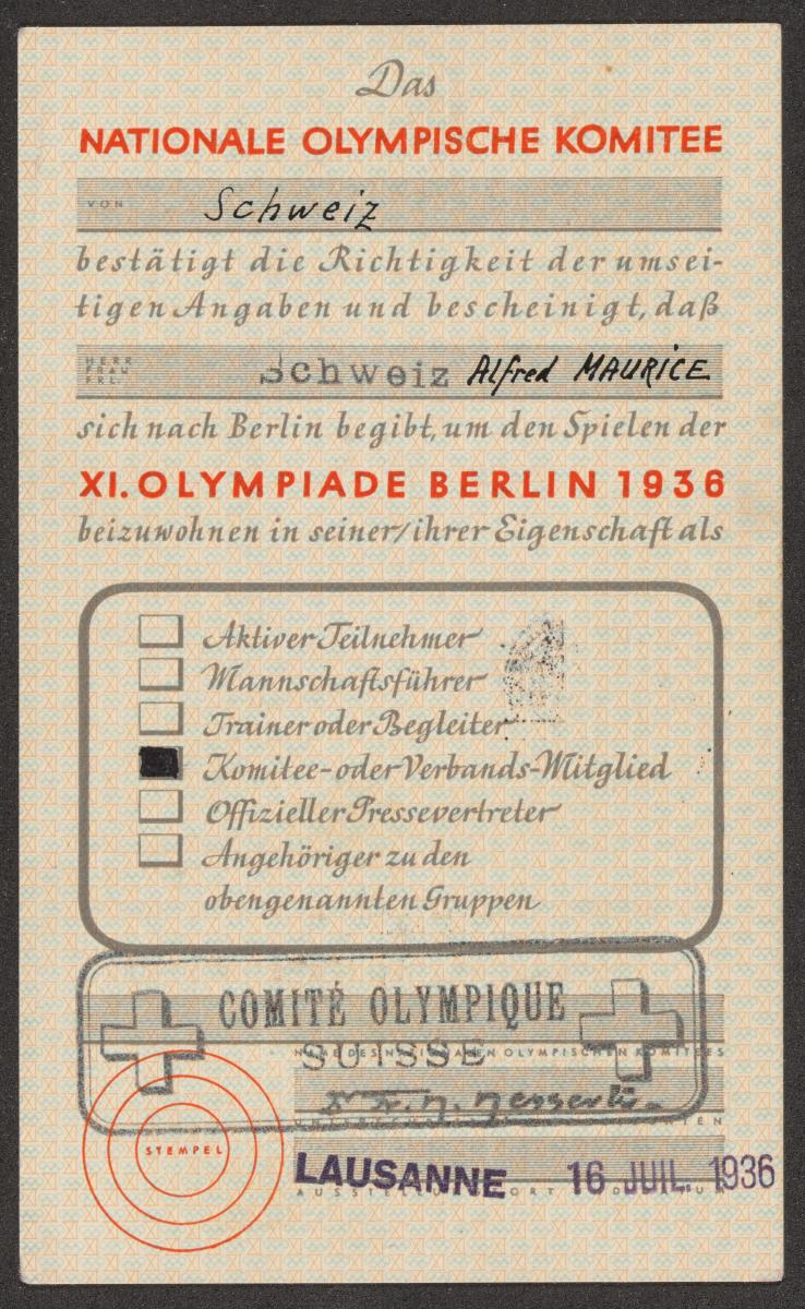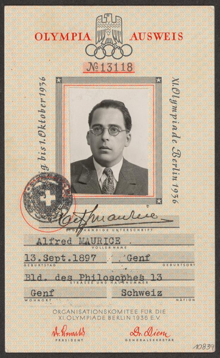 Berlin 1936, identity card of Alfred Maurice, Swiss official.
