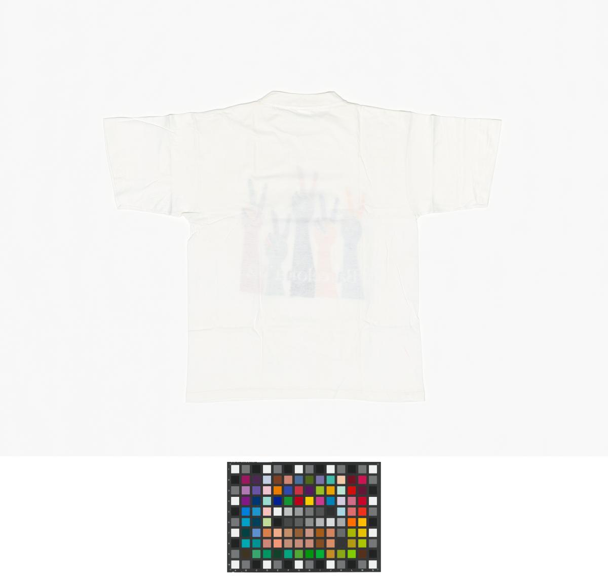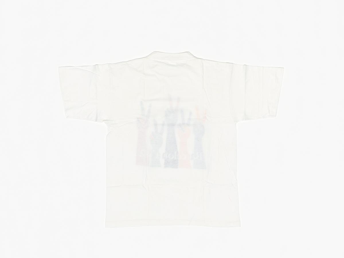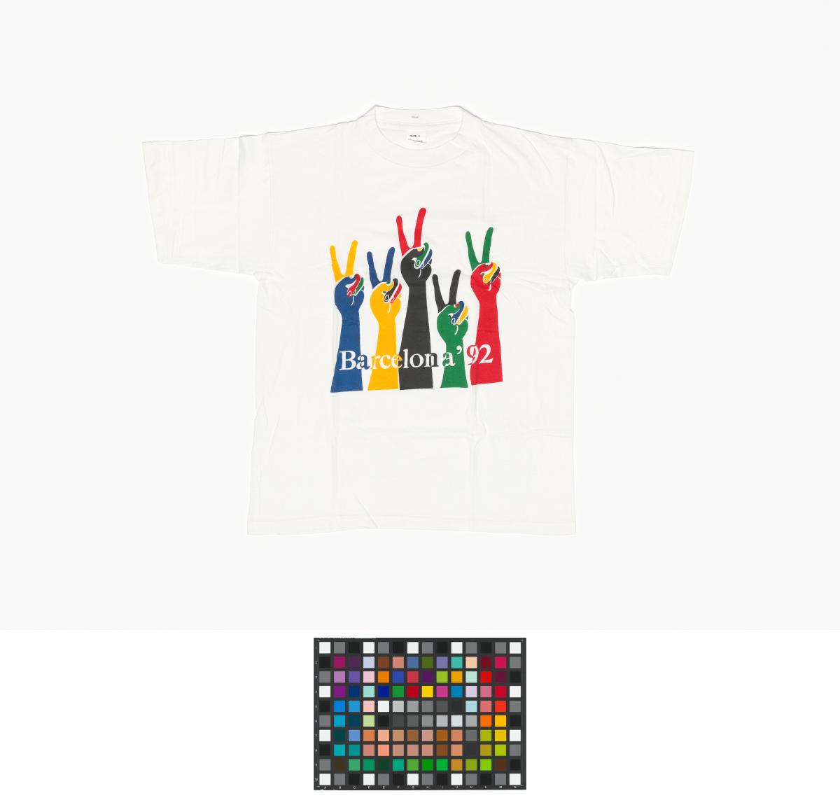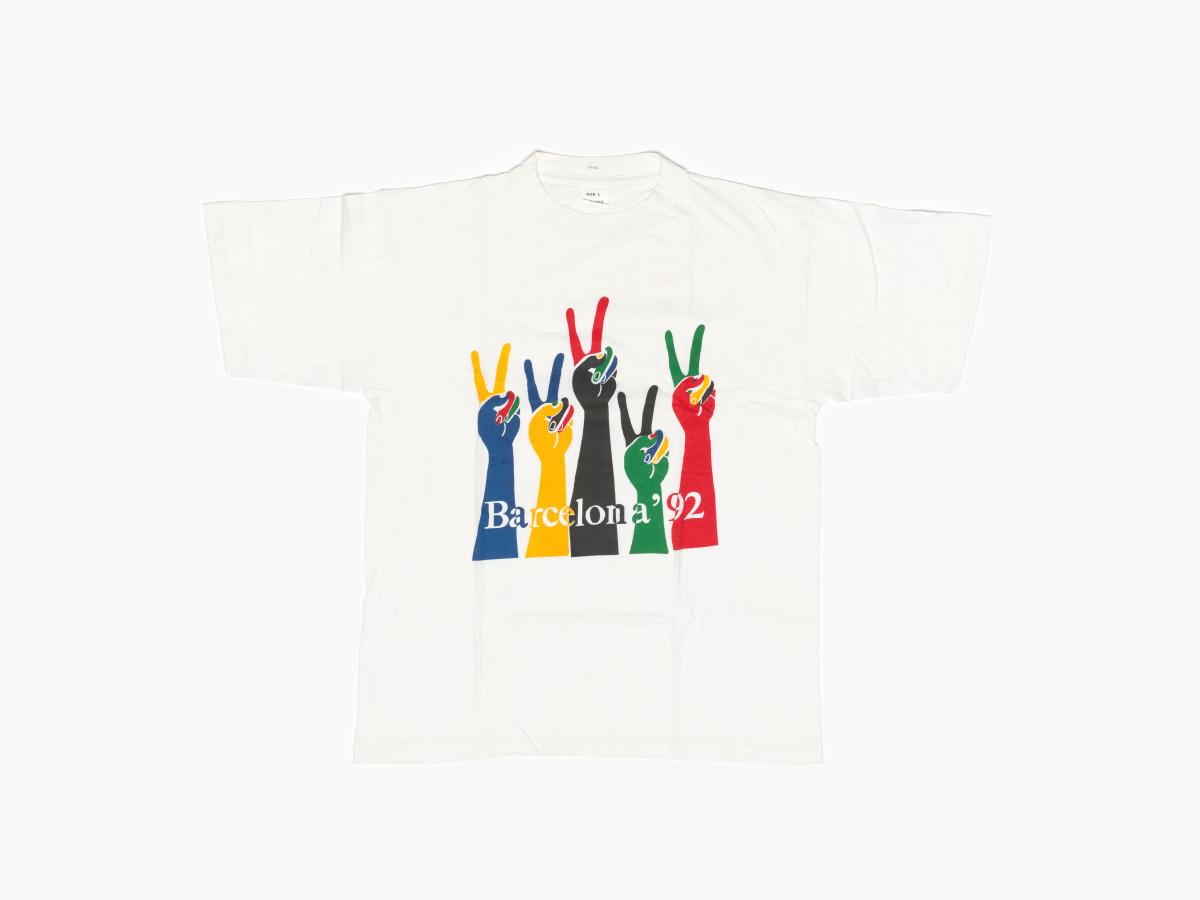 On the front, there are five multicoloured arms with the V sign. At the bottom, there is the inscription "Barcelona '92". Size L.