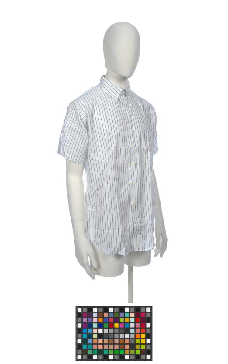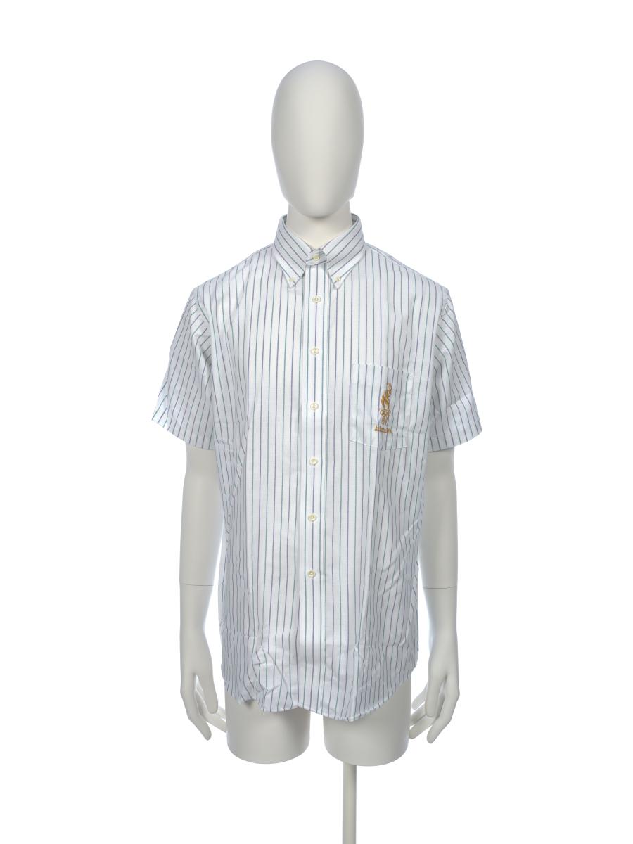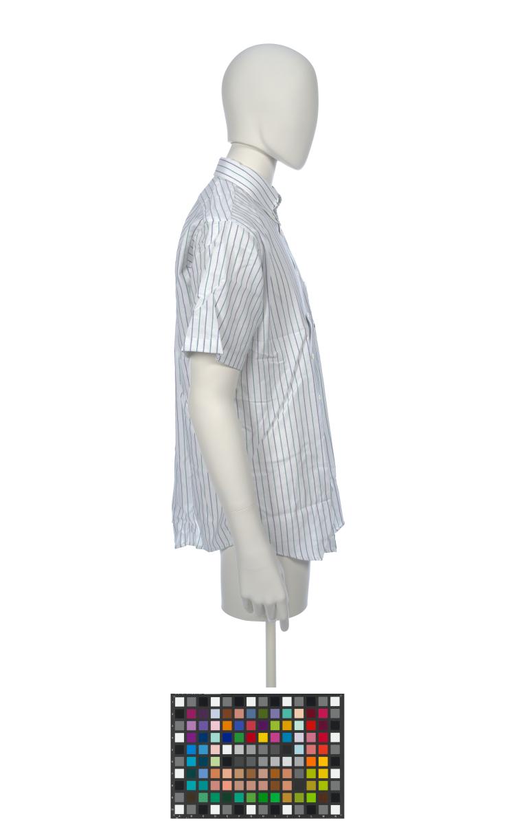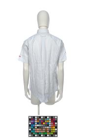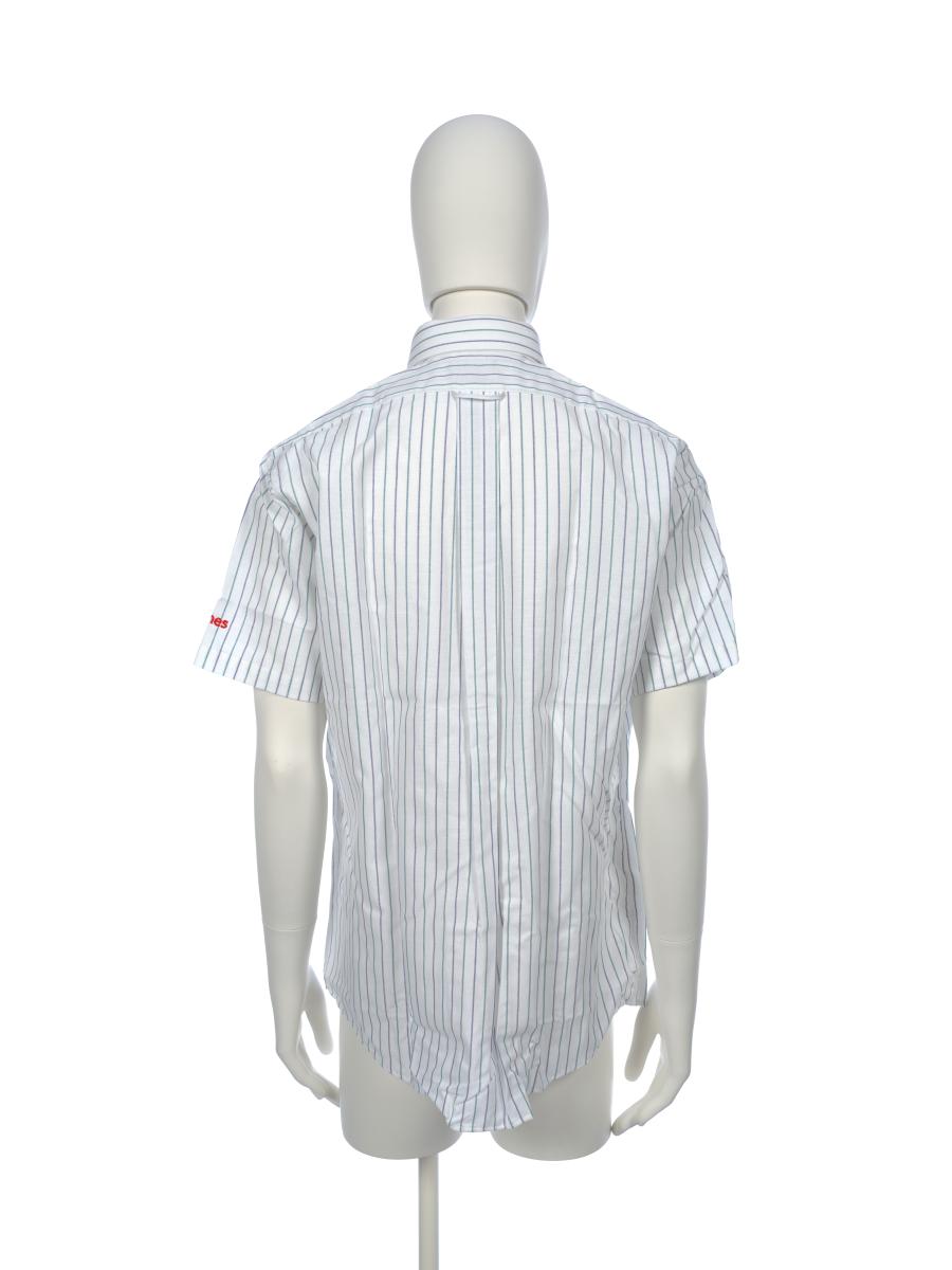 Short sleeves shirt, with fine blue and green lines. On the breast pocket, there is the Games' emblem.