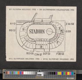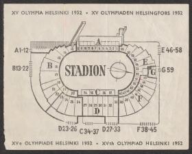Pattern of the poster with Paavo Nurmi running with the olympic rings on the background. Map of the stadium on the back. Detached coupon.