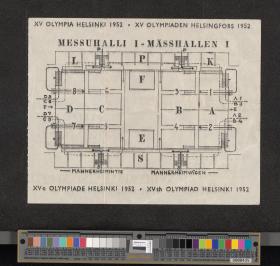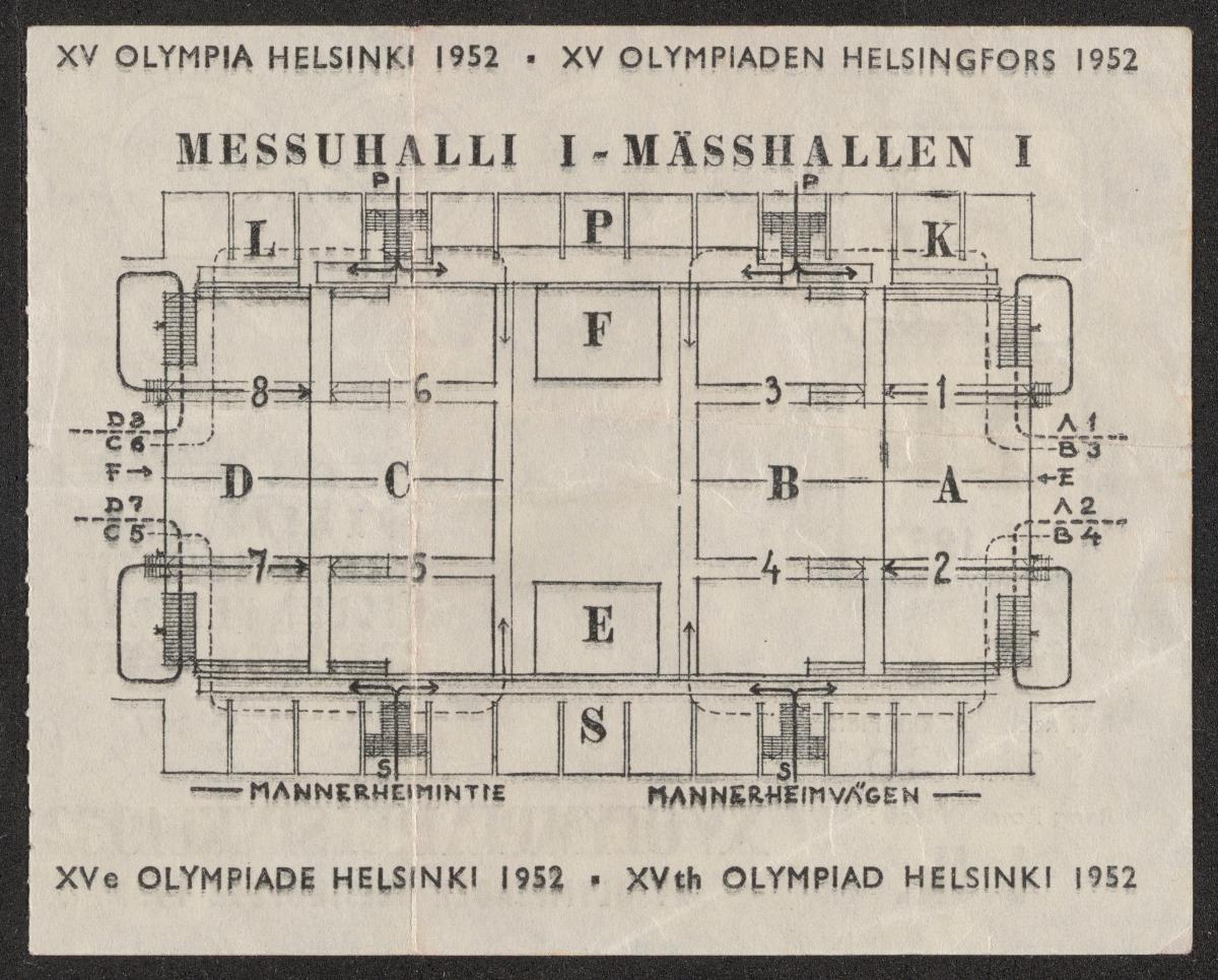 Pattern of the poster with Paavo Nurmi running with the olympic rings on the background. Map of the hall on the back. Detached coupon.