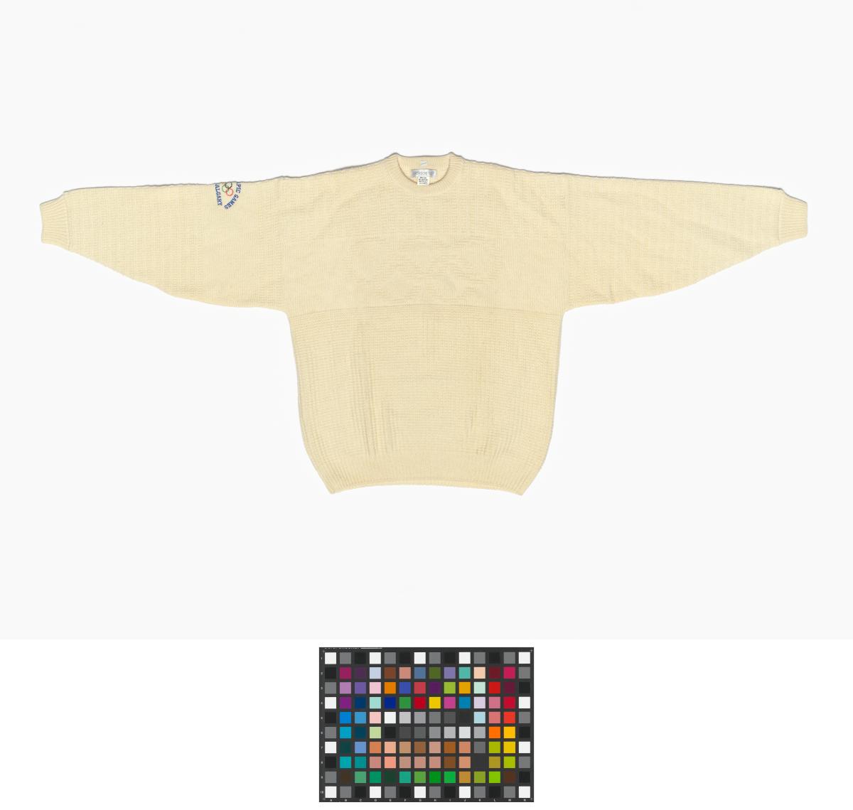 White jumper with the Olympic Rings on the right shoulder and the caption: "USA Olympic Games / 1988 Calgary". Embroidered Olympic Rings on the front. Size XXL.