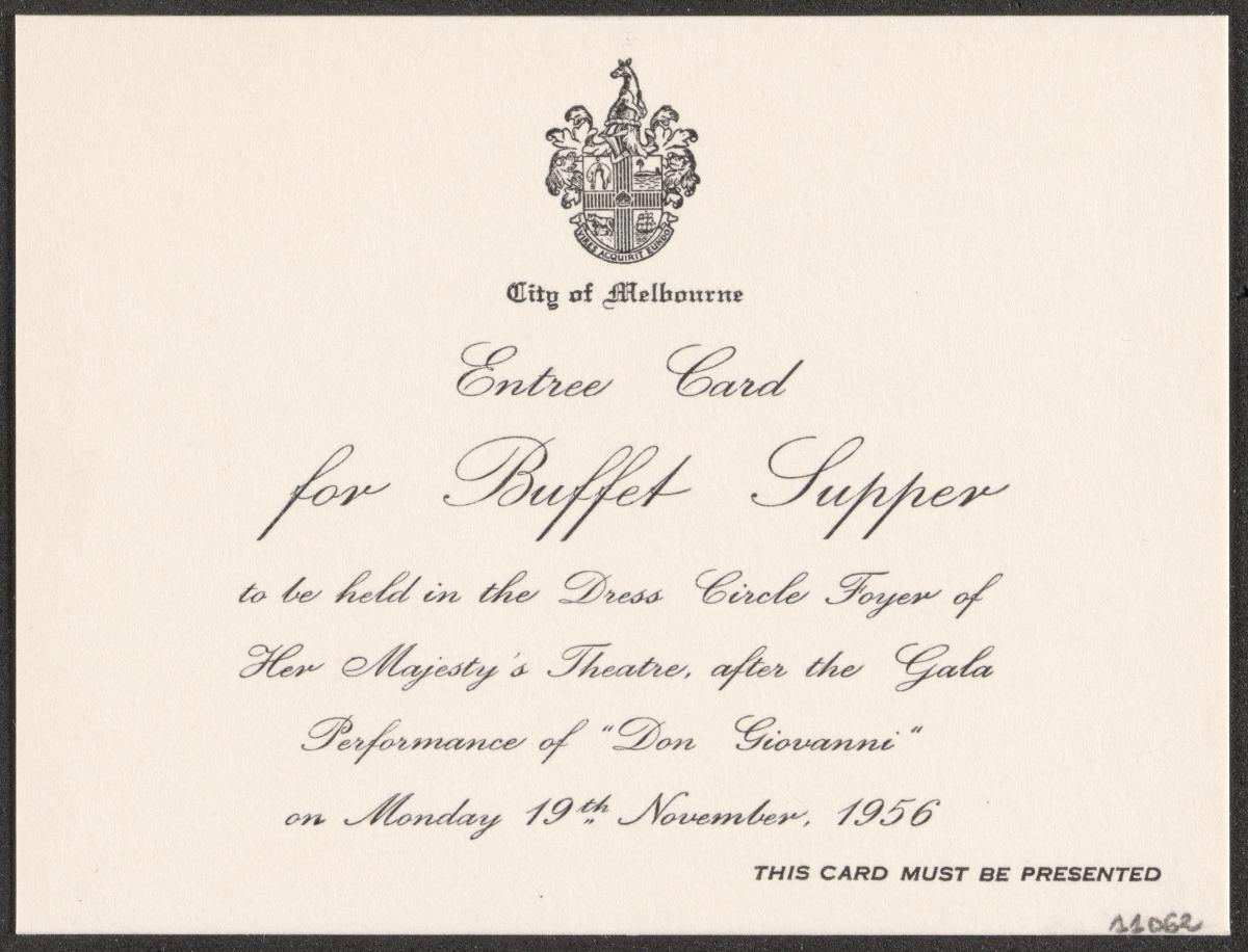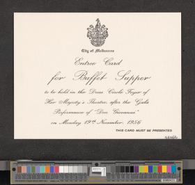 Card with the arms of the city of Melbourne. Text: "Entrée Card / for Buffet Supper / to be held in the Dress Circle Foyer of / Her Majesty's Theater, after the Gala / Performance of -Don Giovanni- / on Monday 19th November, 1956".