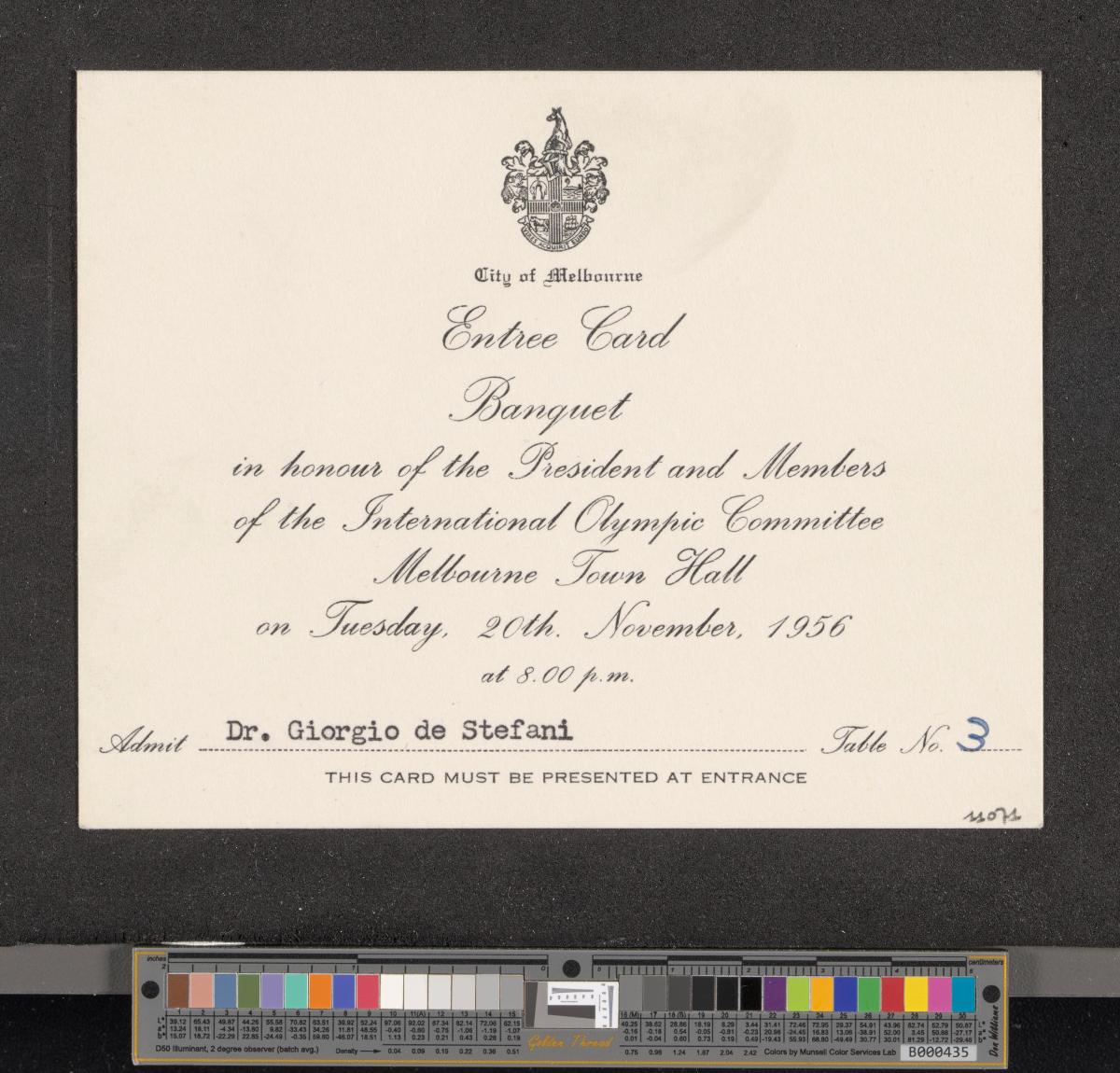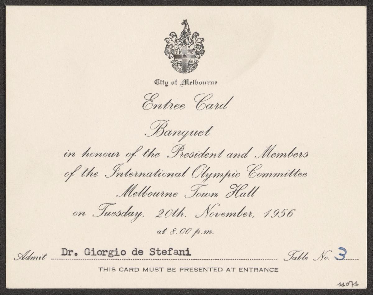 Card with the arms of the city of Melbourne. Text: "Entree Card / Banquet / in honour of the President and Members / of the International Olympic Committee / Melbourne Town Hall / on Tuesday, 20th. November, 1956 / at 8.00 p.m. / Admit Dr. Giorgio de Stefani Table No. 3".