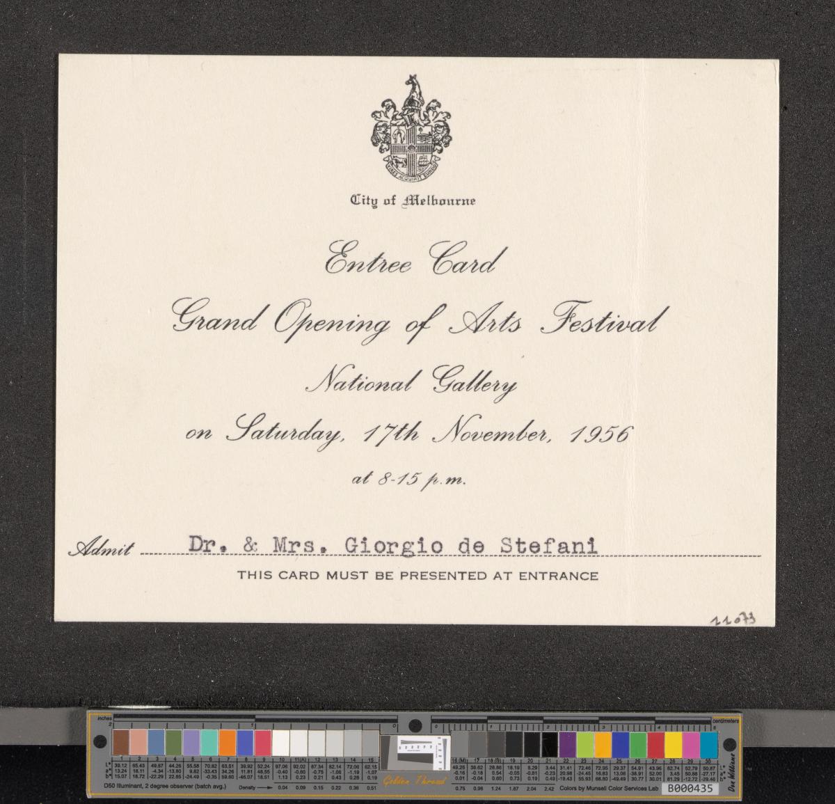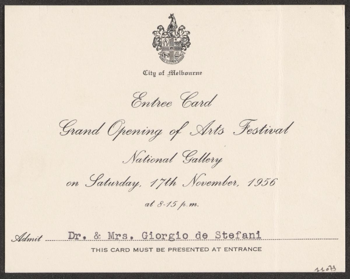 Card with the arms of the city of Melbourne. Text: "Entree Card / Grand Opening of Arts Festival / National Gallery / on Saturday, 17th November, 1956 / at 8.15 p.m. / Admit Dr. & Mrs. Giorgio de Stefani".