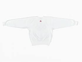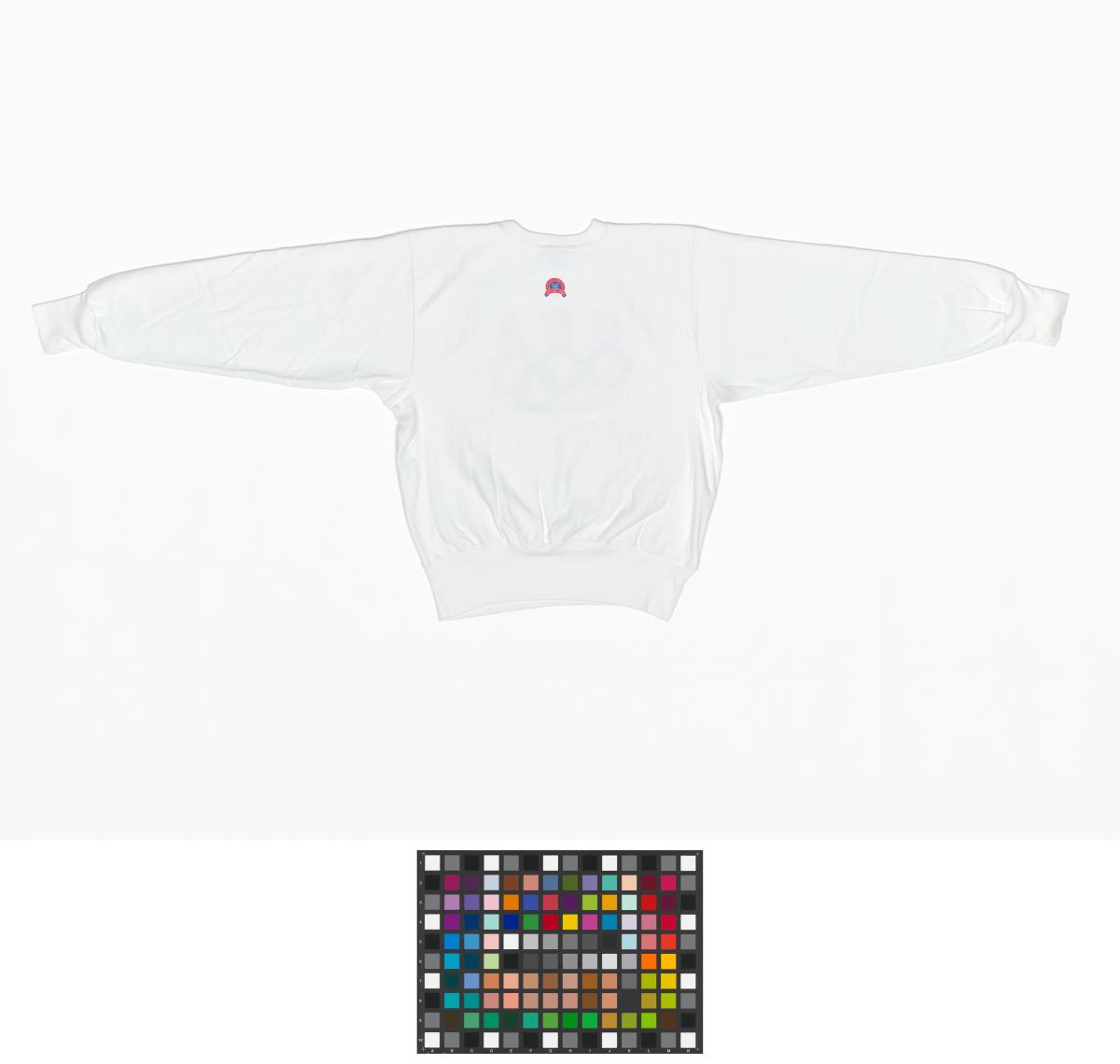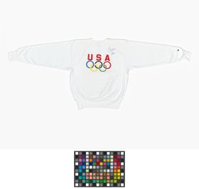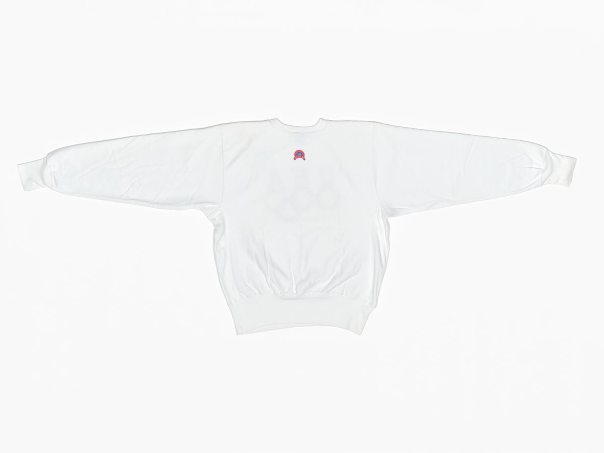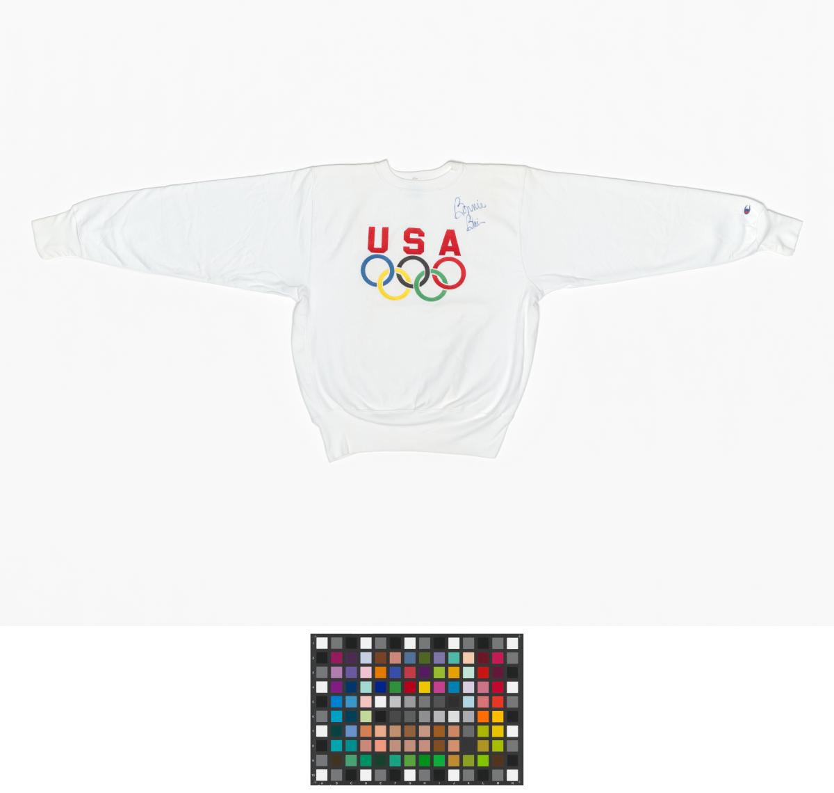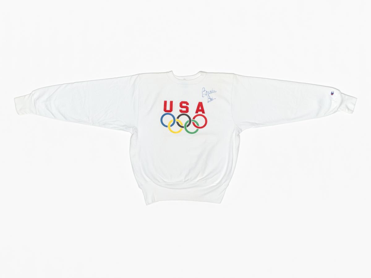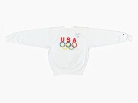 White sweater with the UNited States NOC emblem on the front and Bonnie Blair's signature on the upper left. Size L.