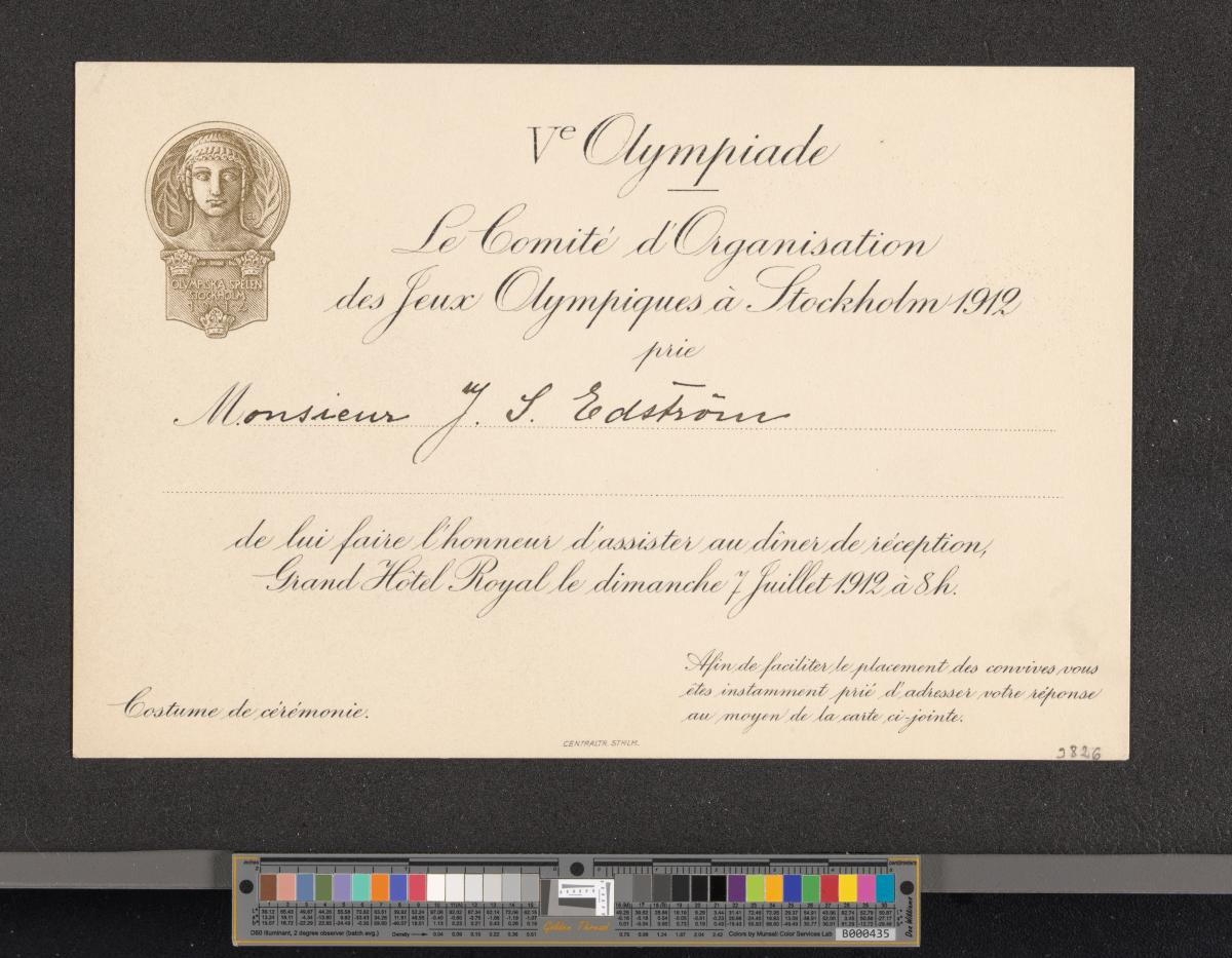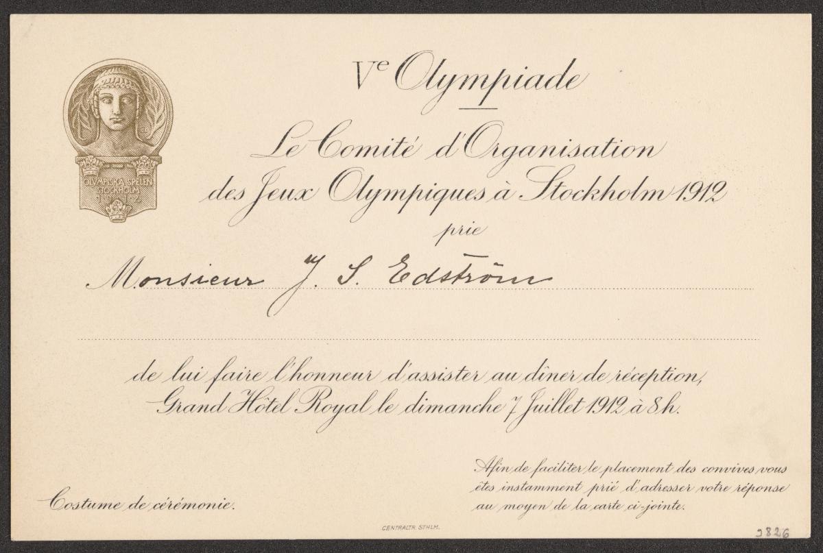 Invitation card with the function badge issued for the members of the Organising Committee in header. Text: "Ve Olympiade / Le Comité d'Organisation / des Jeux Olympiques à Stockholm 1912 / prie / Monsieur J. S. Edström / de lui faire l'honneur d'assister au dîner de réception, / Grand Hôtel Royal le dimanche 7 juillet 1912 à 8h.".