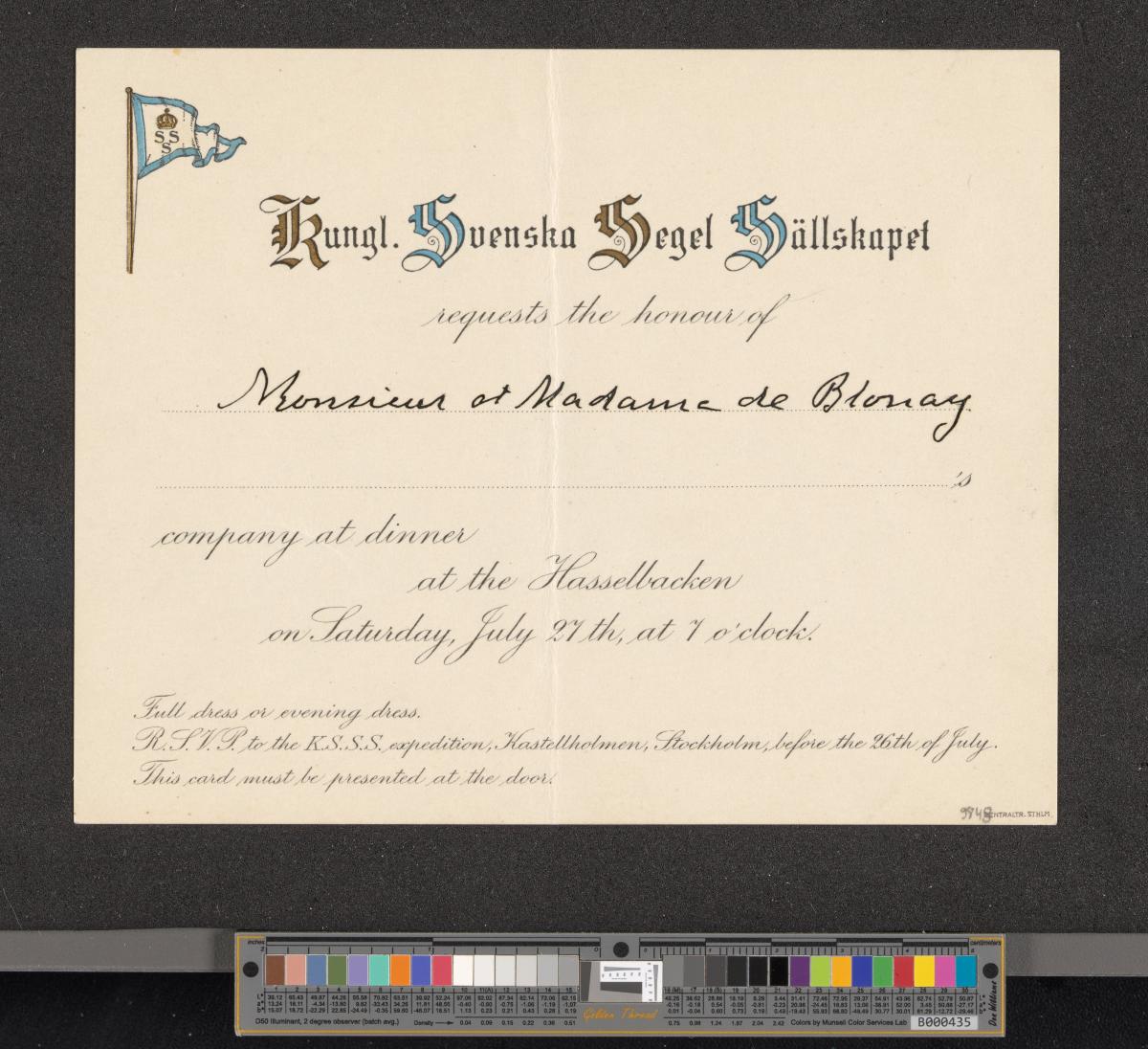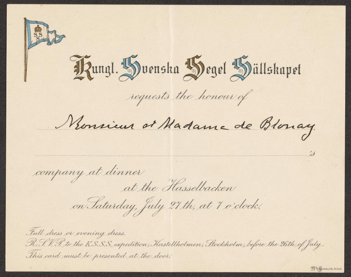 Invitation card with the club logo, text: "Kungl. Svenska Segel Sällskapet / requests the honour of / Monsieur et Madame de Blonay / 's / company at dinner / at the Hasselbacken / on Saturday, July 27 th, at 7 o'clock.".