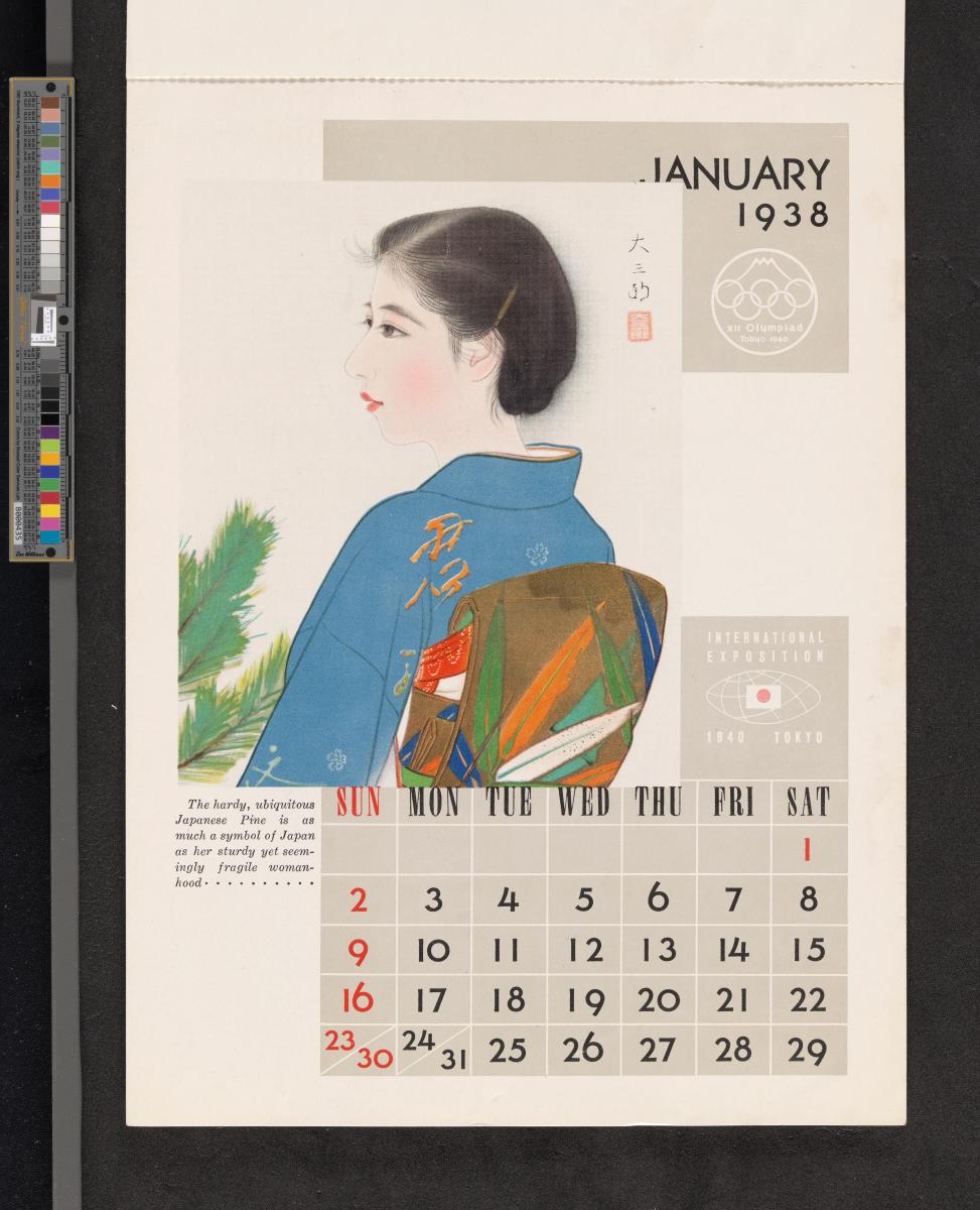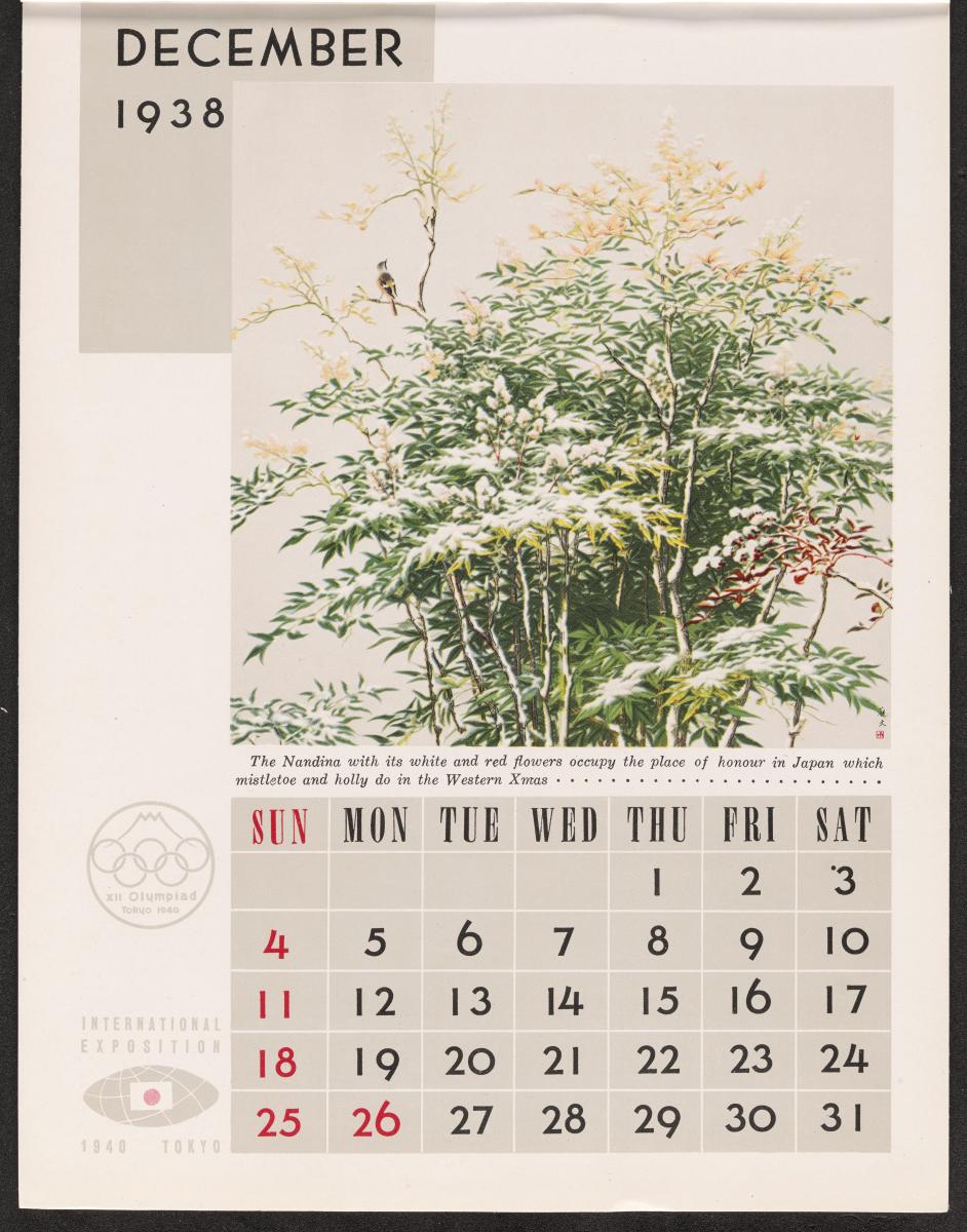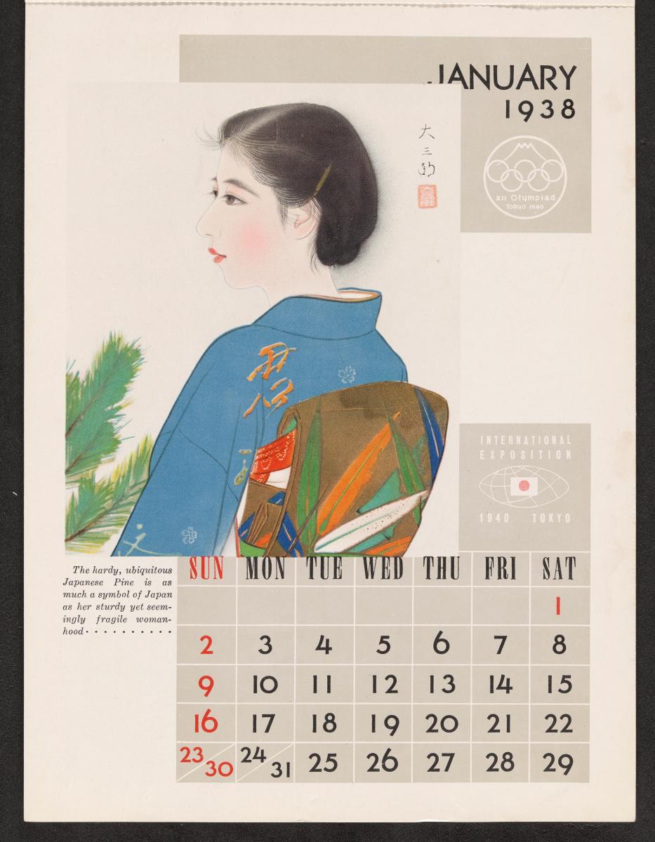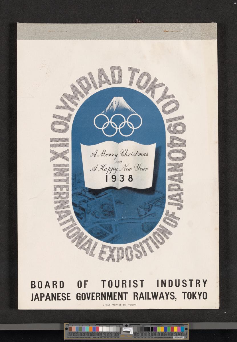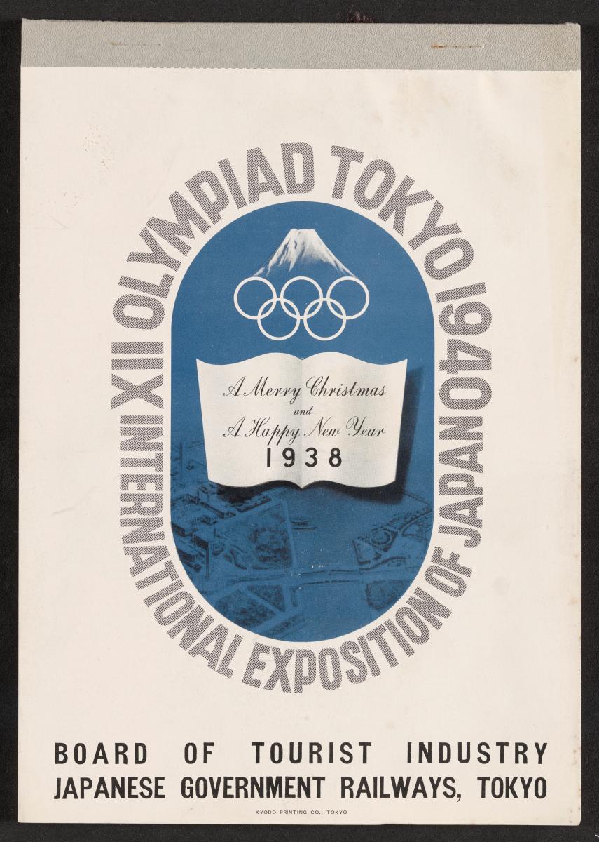 Calendar of 1938 illustrated by hinges of life and traditions in Japan. On the cover there is the emblem of the Games with the captions: "XII Olympiad Tokyo 1940 ; International Exposition of Japan", "A Merry Christmas / and / a Happy New Year / 1938". And the mention at the bottom: "Board of Tourist Industry / Japanese Government Railways, Tokyo".