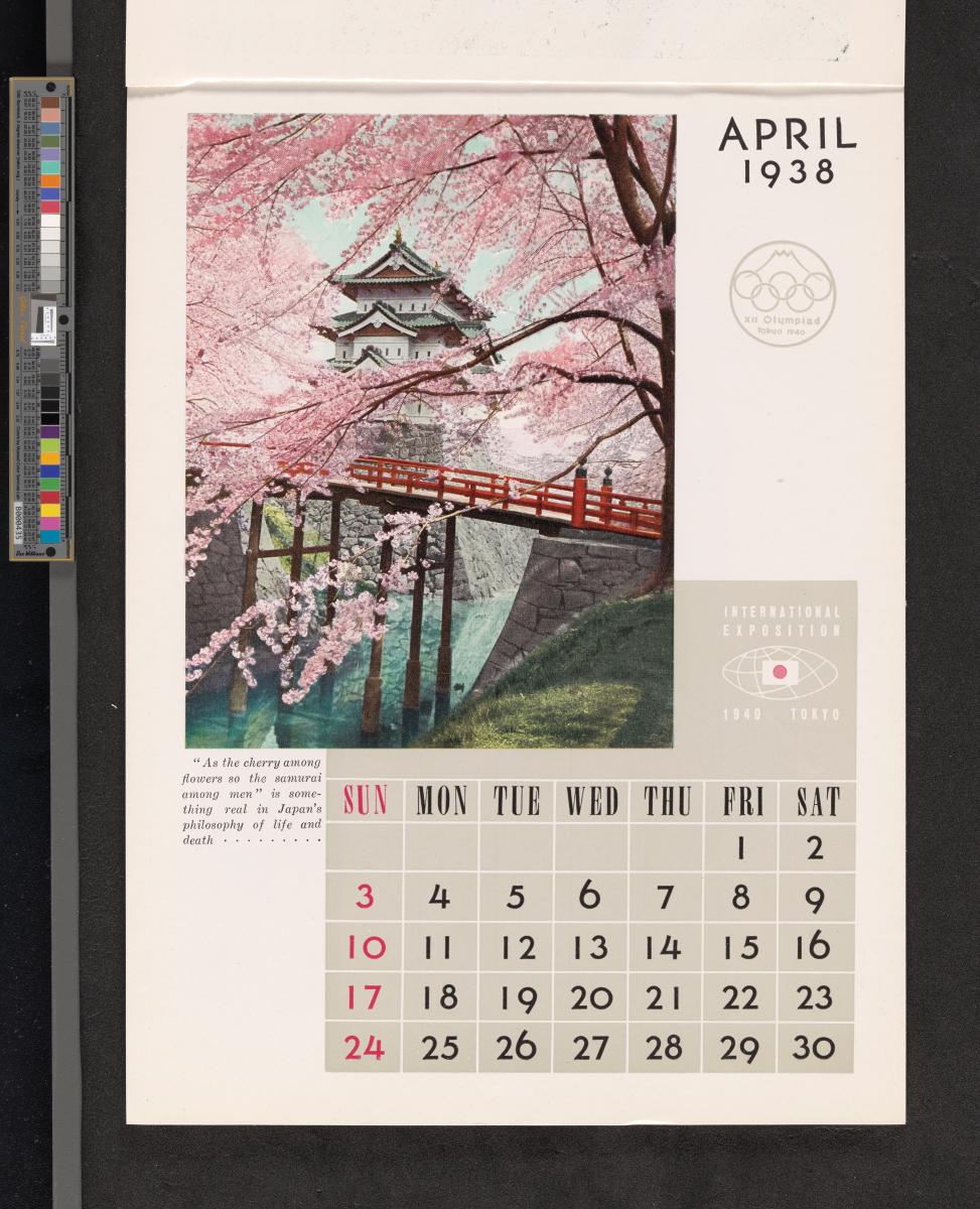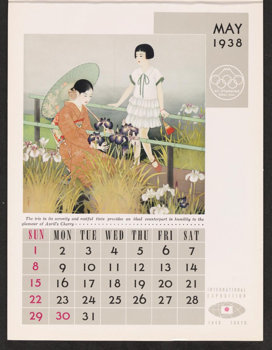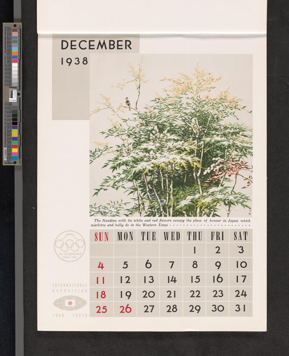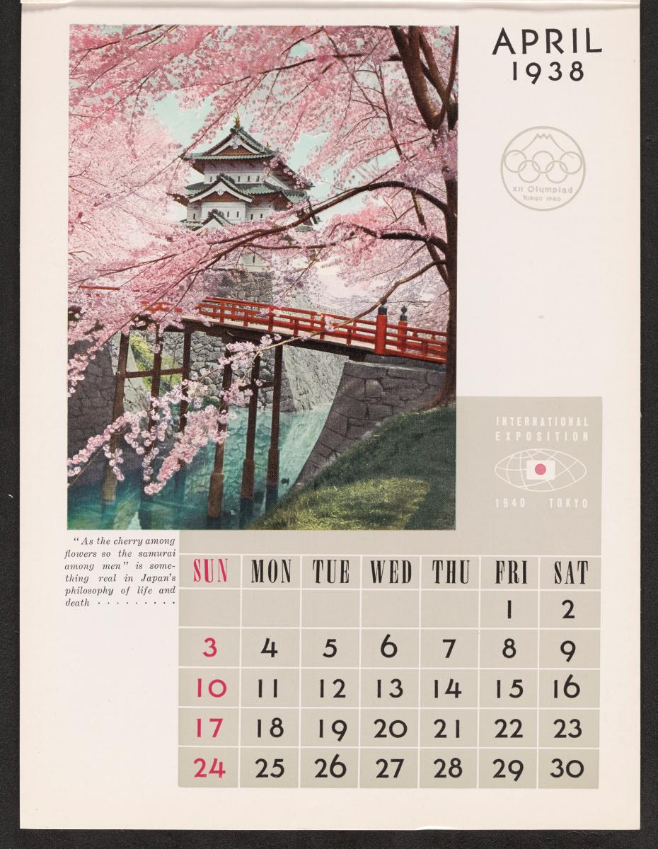 Calendar of 1938 illustrated by hinges of life and traditions in Japan. On the cover there is the emblem of the Games with the captions: "XII Olympiad Tokyo 1940 ; International Exposition of Japan", "A Merry Christmas / and / a Happy New Year / 1938". And the mention at the bottom: "Board of Tourist Industry / Japanese Government Railways, Tokyo".