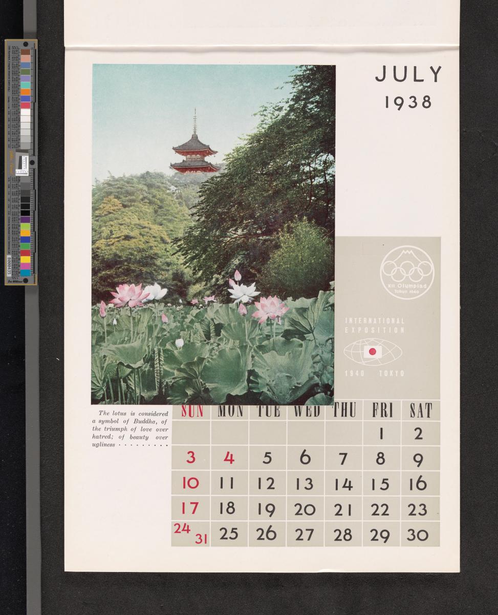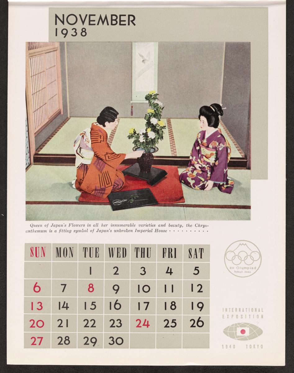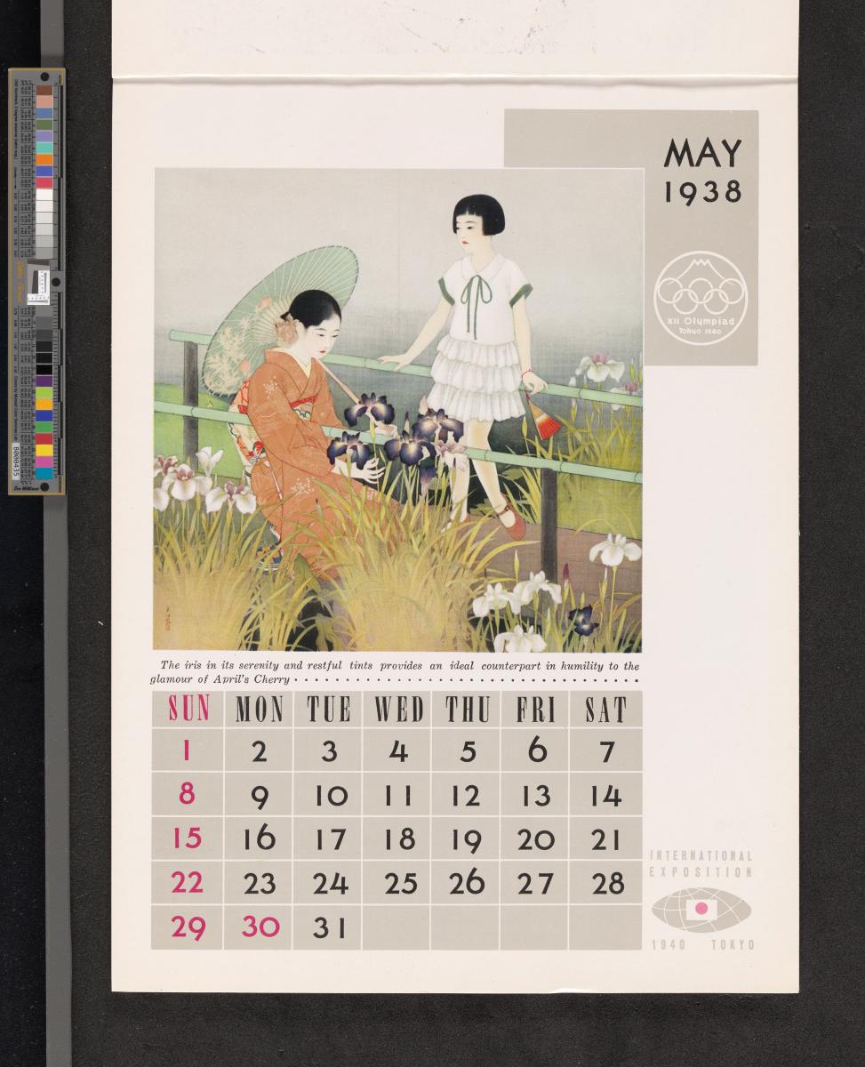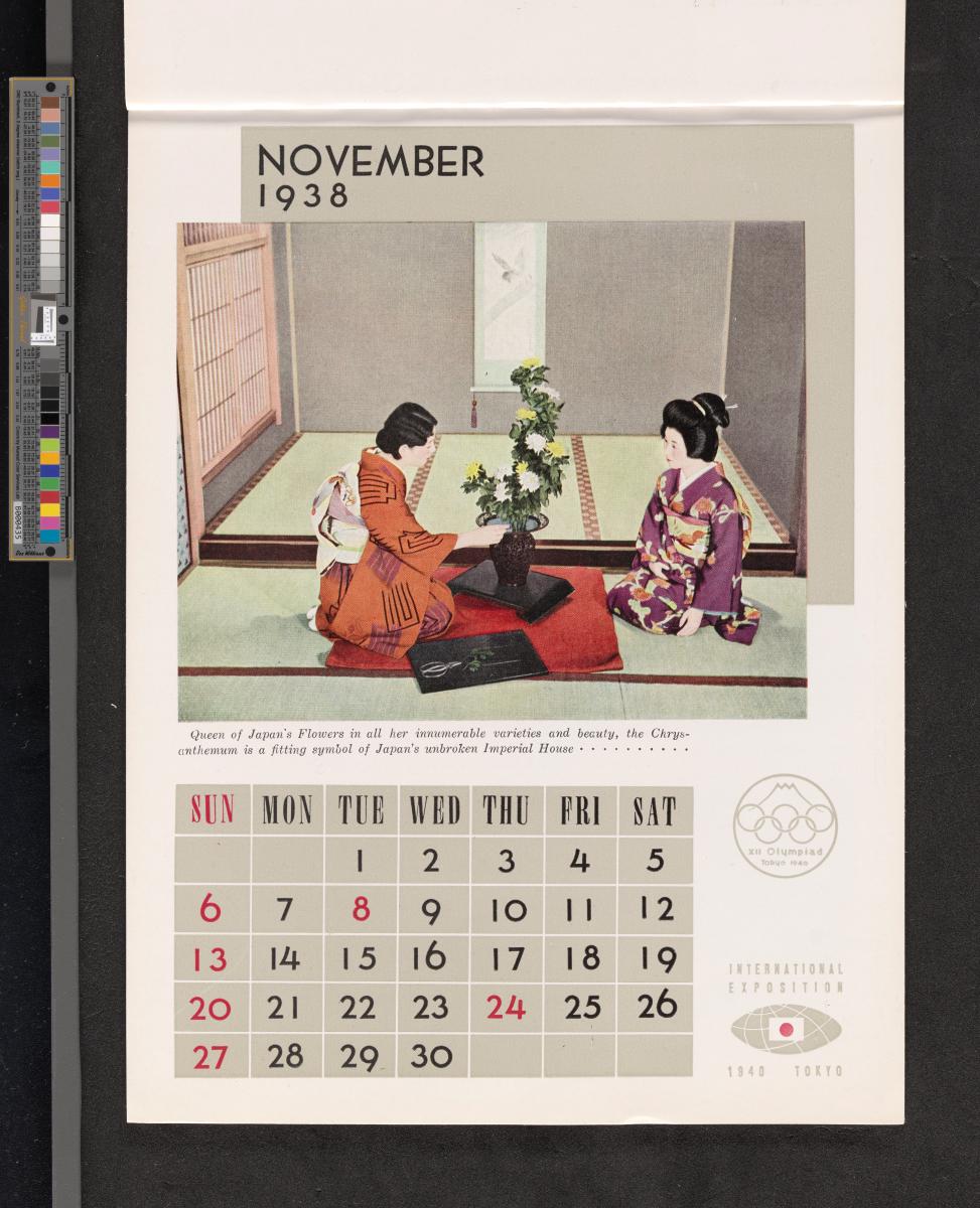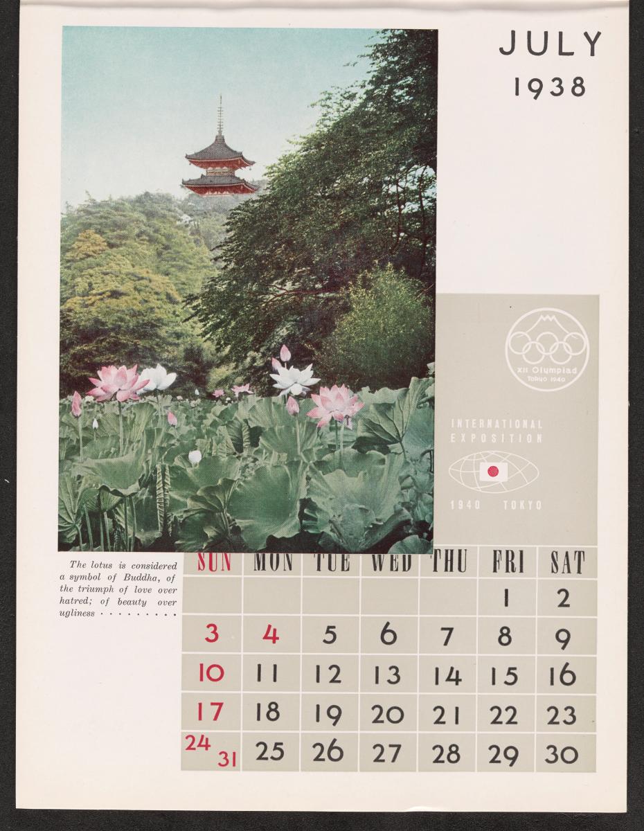 Calendar of 1938 illustrated by hinges of life and traditions in Japan. On the cover there is the emblem of the Games with the captions: "XII Olympiad Tokyo 1940 ; International Exposition of Japan", "A Merry Christmas / and / a Happy New Year / 1938". And the mention at the bottom: "Board of Tourist Industry / Japanese Government Railways, Tokyo".