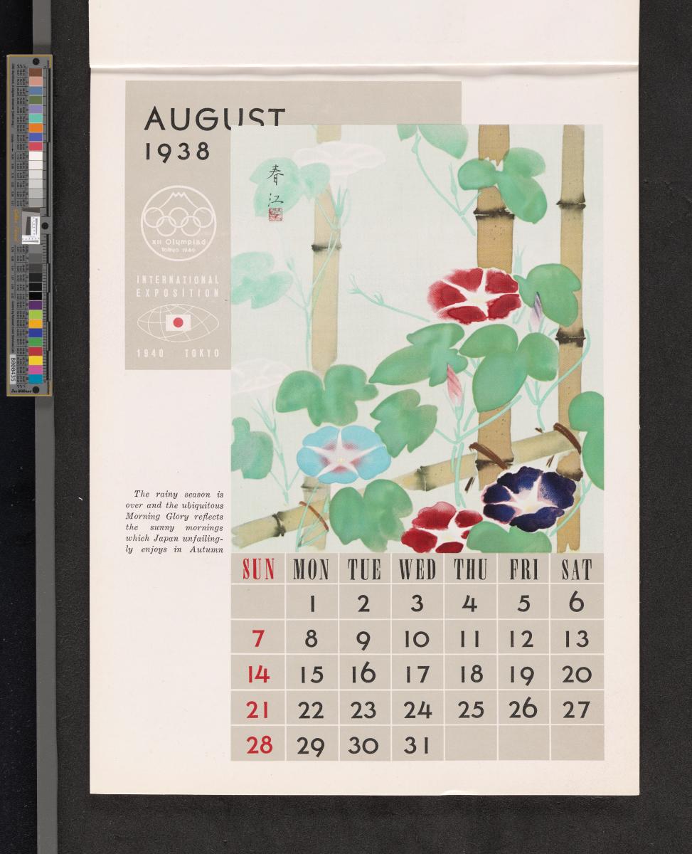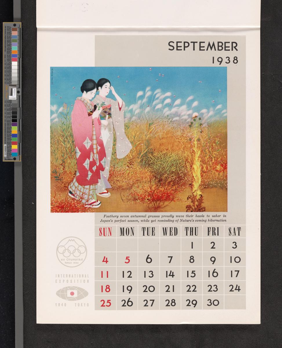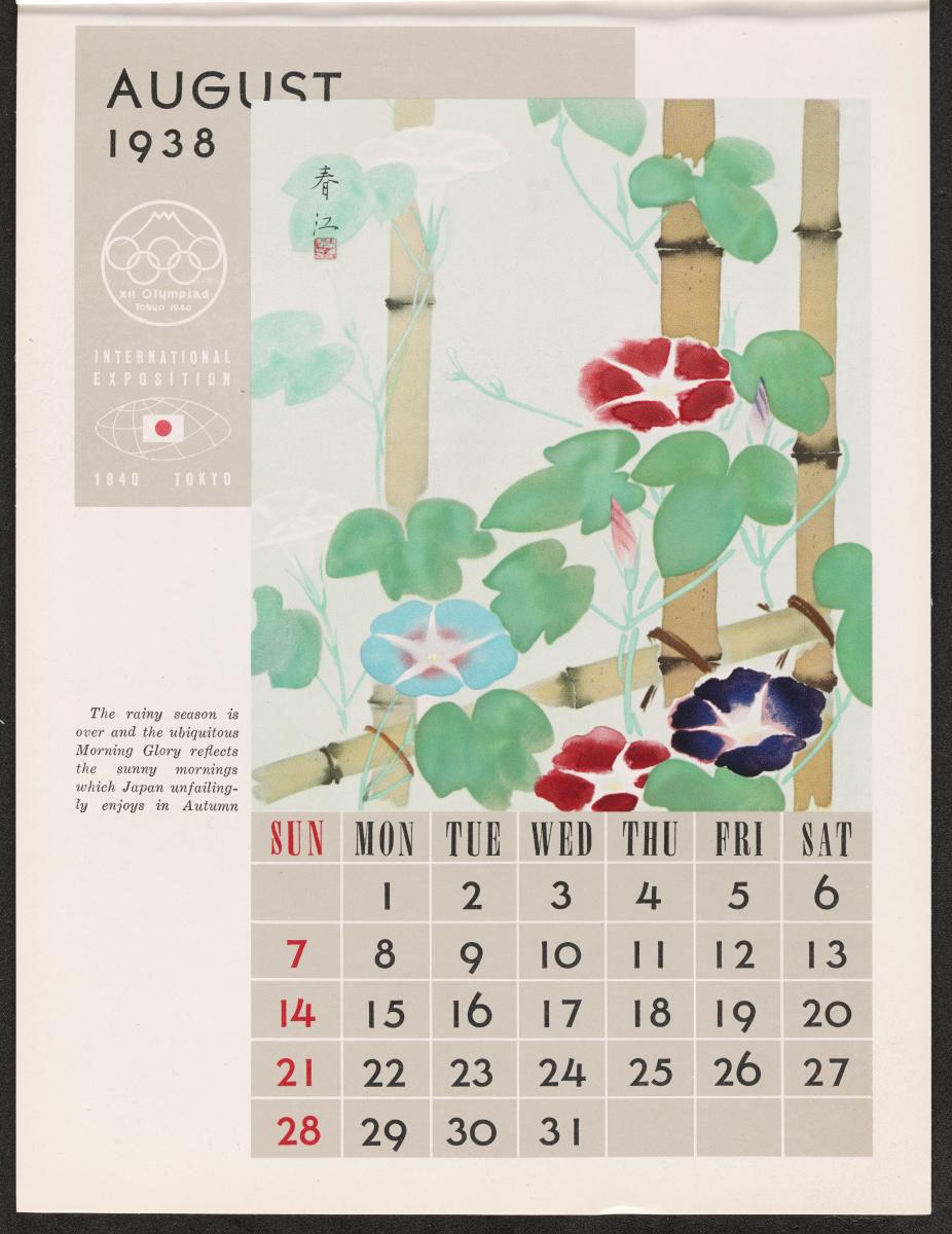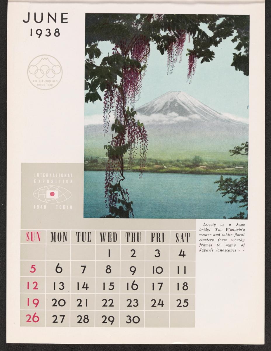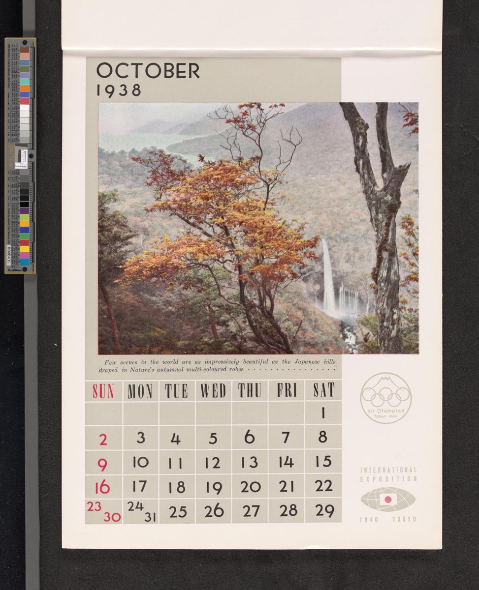 Calendar of 1938 illustrated by hinges of life and traditions in Japan. On the cover there is the emblem of the Games with the captions: "XII Olympiad Tokyo 1940 ; International Exposition of Japan", "A Merry Christmas / and / a Happy New Year / 1938". And the mention at the bottom: "Board of Tourist Industry / Japanese Government Railways, Tokyo".