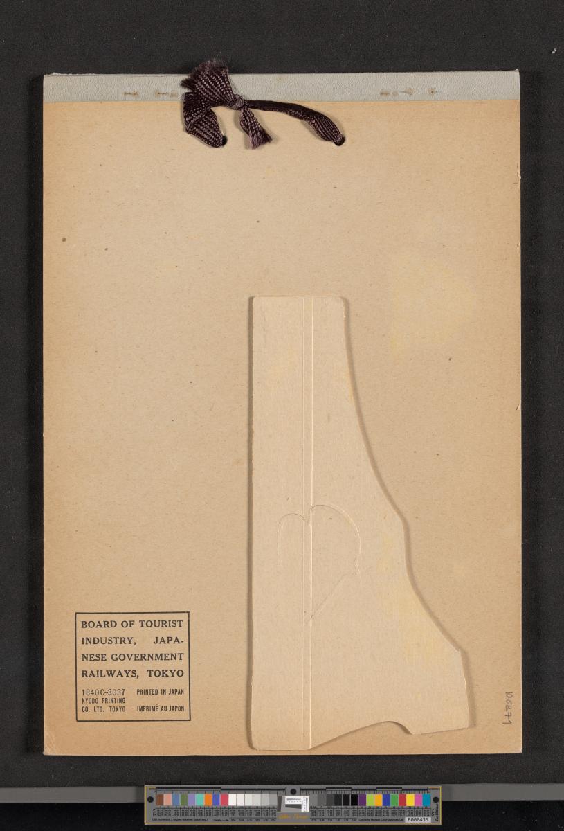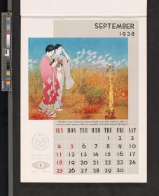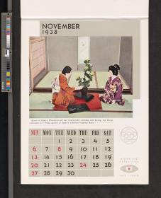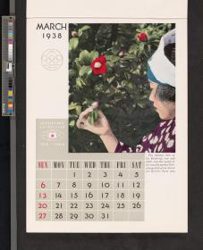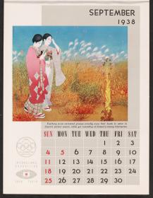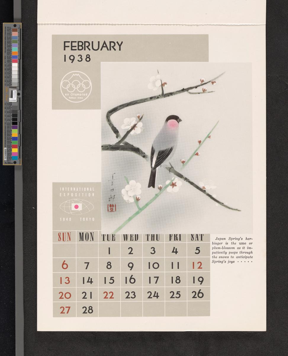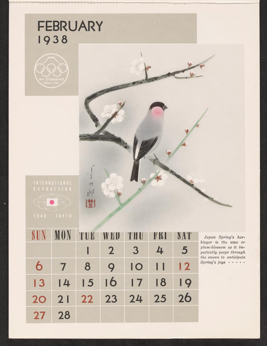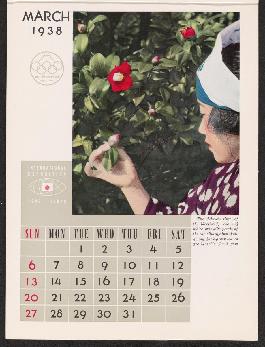 Calendar of 1938 illustrated by hinges of life and traditions in Japan. On the cover there is the emblem of the Games with the captions: "XII Olympiad Tokyo 1940 ; International Exposition of Japan", "A Merry Christmas / and / a Happy New Year / 1938". And the mention at the bottom: "Board of Tourist Industry / Japanese Government Railways, Tokyo".