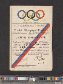 Identity card with the Olympic rings and Olympic Motto. On the back: photgraph and signature of the official and visa of the Italian Olympic Committee.
