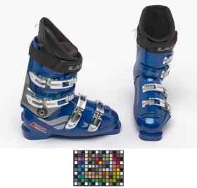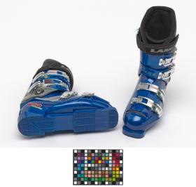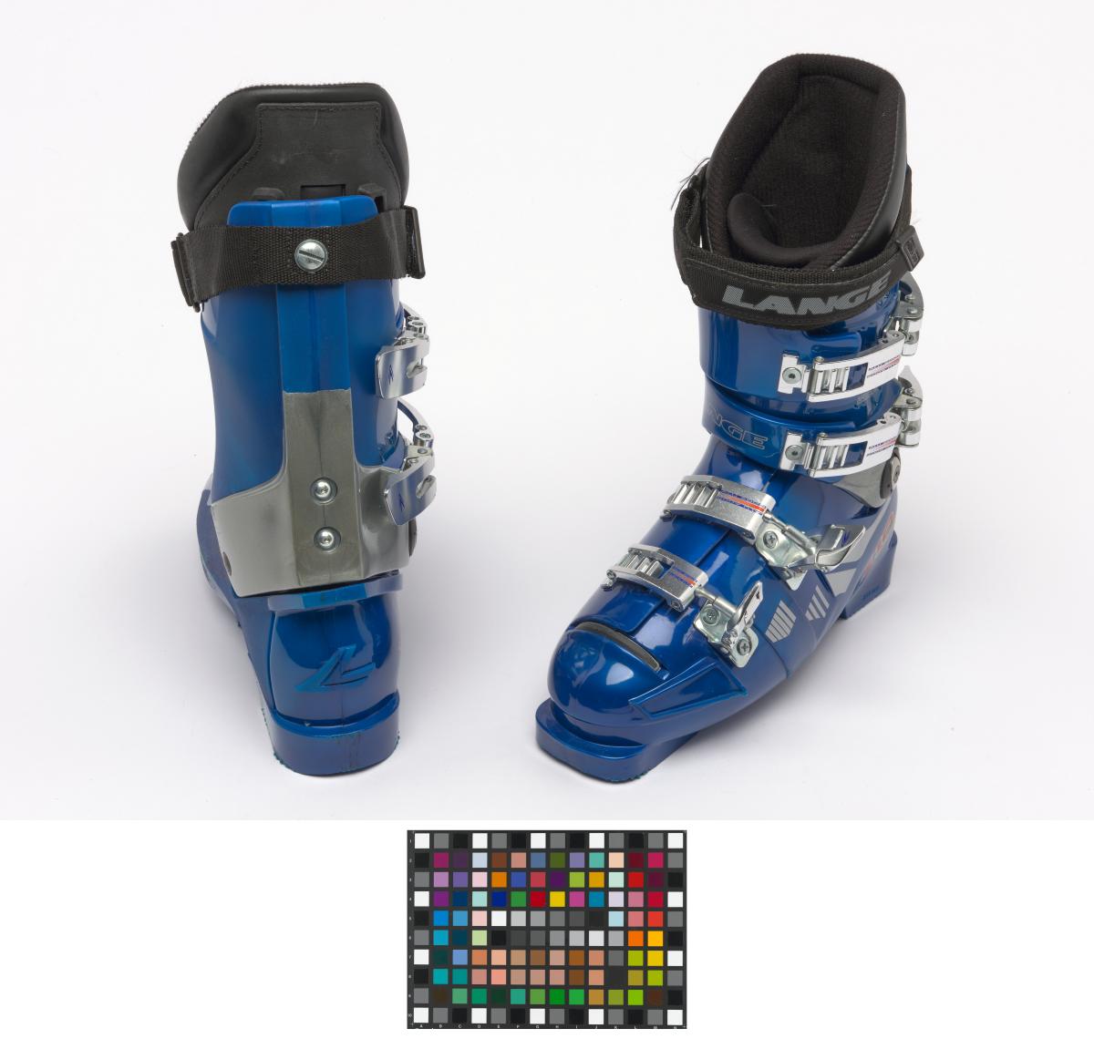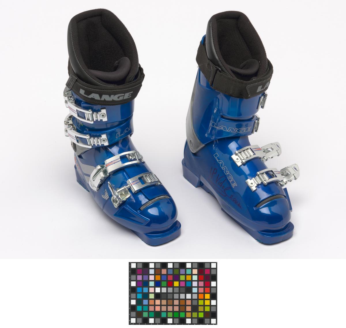 Lange alpine ski shoes, "World Cup Fit L 10" model. 4 aluminium bindings. The athlete's signature on both shoes.