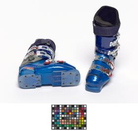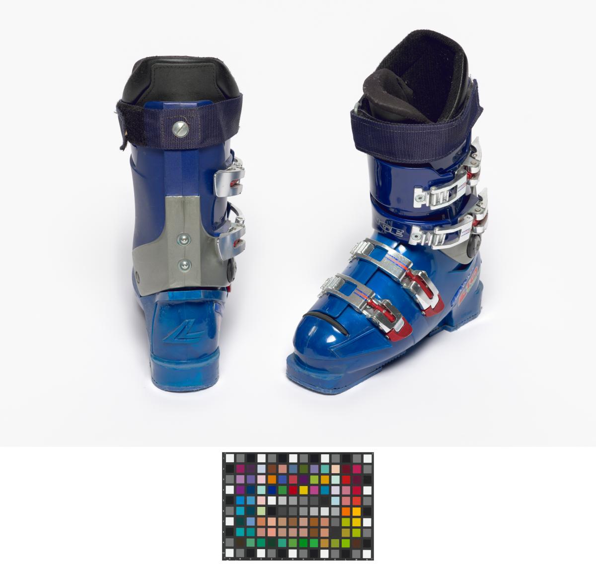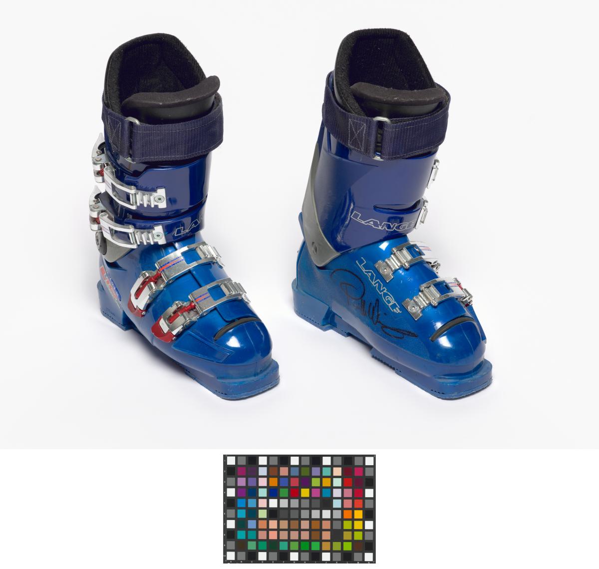 Lange alpine ski shoes, "World Cup Fit L 10" model. 4 aluminium bindings. The athlete's signature on both shoes.