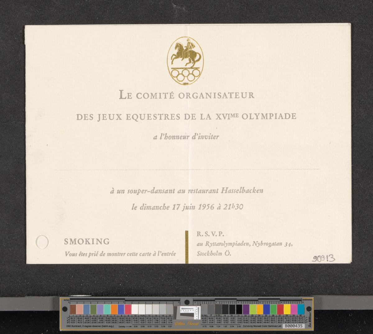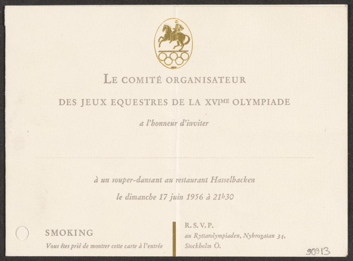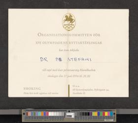 Card with the emblem of the Games. Text: "LE COMITÉ ORGANISATEUR / DES JEUX EQUESTRES DE LA XVIme OLYMPIADE / a l'honneur d'inviter / DR DE STEFANI / à un souper-dansant au restaurant Hassselbacken / le dimanche 17 juin 1956 à 21h30".