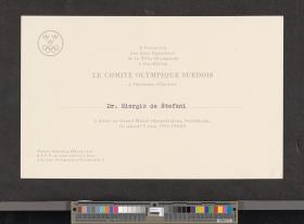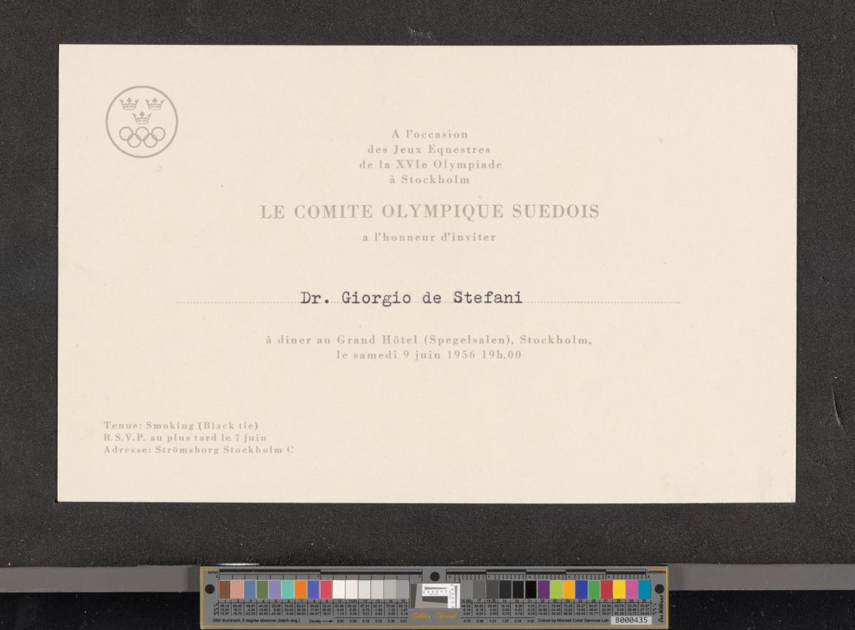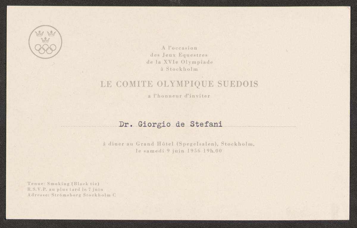 Card with the emblem of the Swedish NOC. text: "A l'occasion / des Jeux Equestres / de la XVIe Olympiade / à Stockholm / LE COMITE OLYMPIQUE SUEDOIS / a l'honneur d'inviter / Dr. Giorgio de Stefani / à diner au Grand Hôtel (Spegelsalen), Stockholm, / le samedi 9 juin 1956 19h.00".