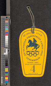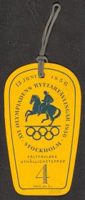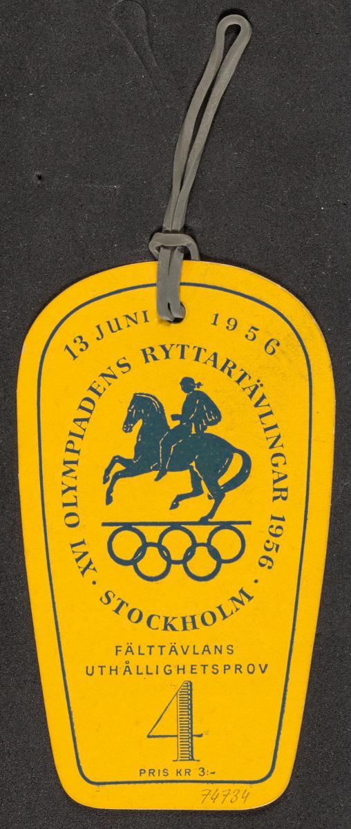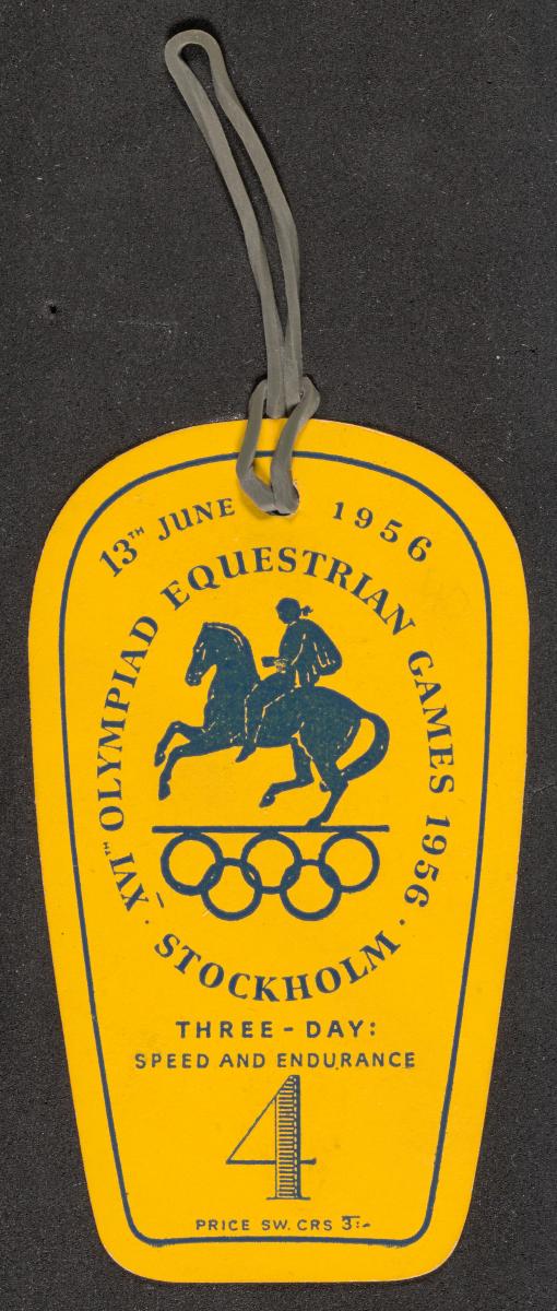 Pass with the emblem of the Games. Text: "13th June 1956 ; Three-day: / Speed and Endurance / 4 / Price SW. CRS 3.-".