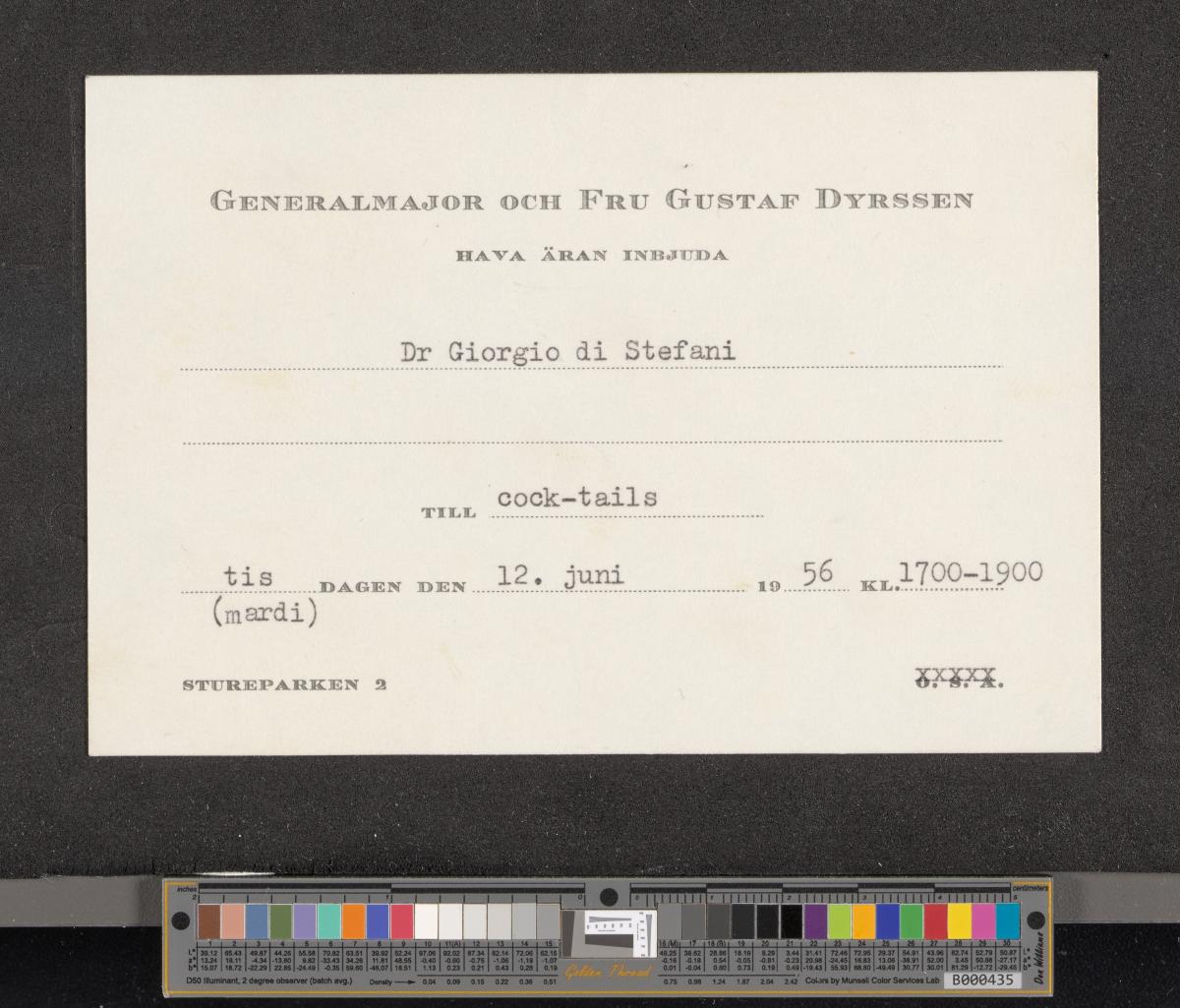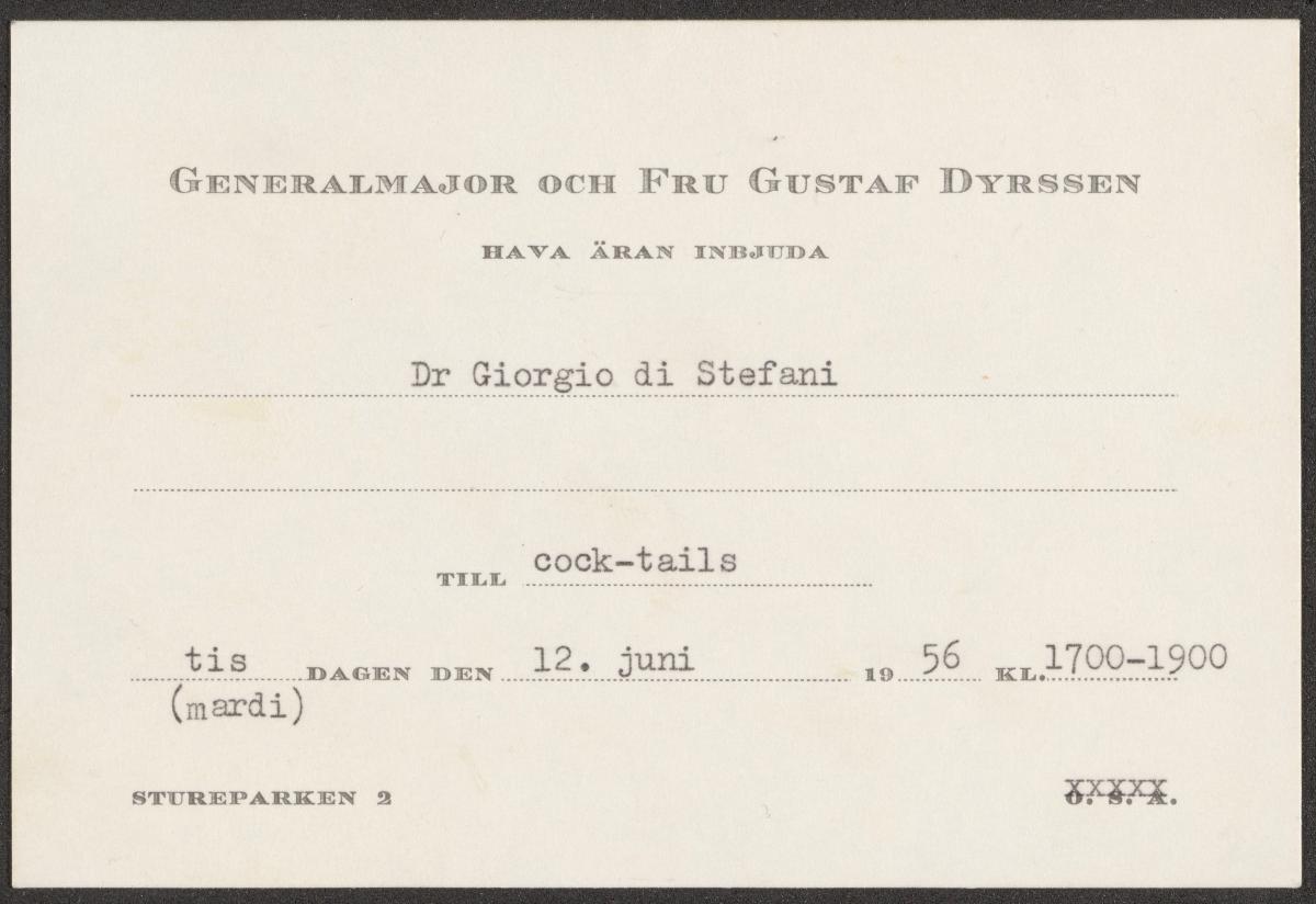Text: "GENERALMAJOR OCH FRU GUSTAF DYRSSEN / HAVA ÄRAN INBJUDA / Dr Giorgio di Stefani / TILL cock-tails / tis (mardi) DAGEN DEN 12. juni 1956 KL. 1700-1900".