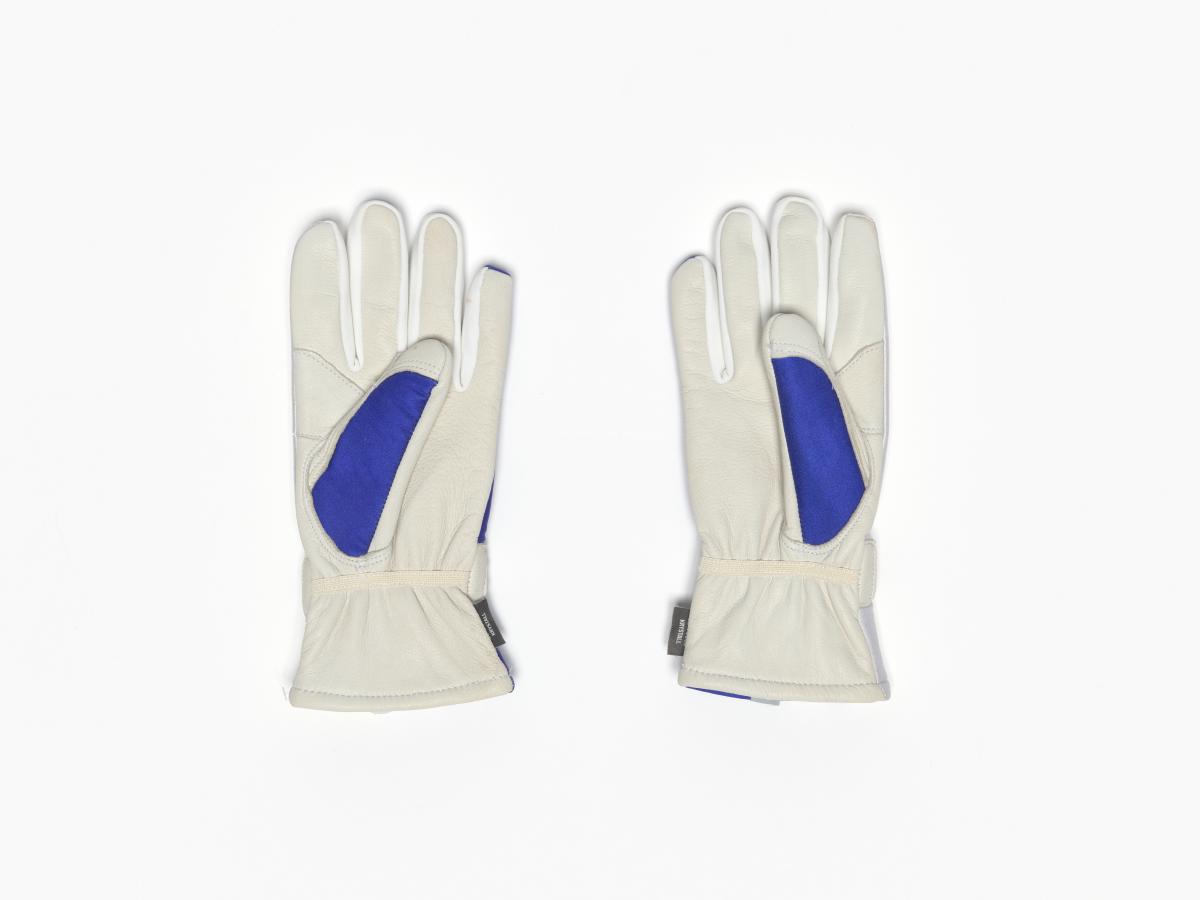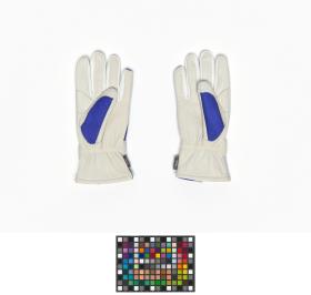 Pair of gloves with geometrical blue and white patterns and Games ' emblem. Size M-
